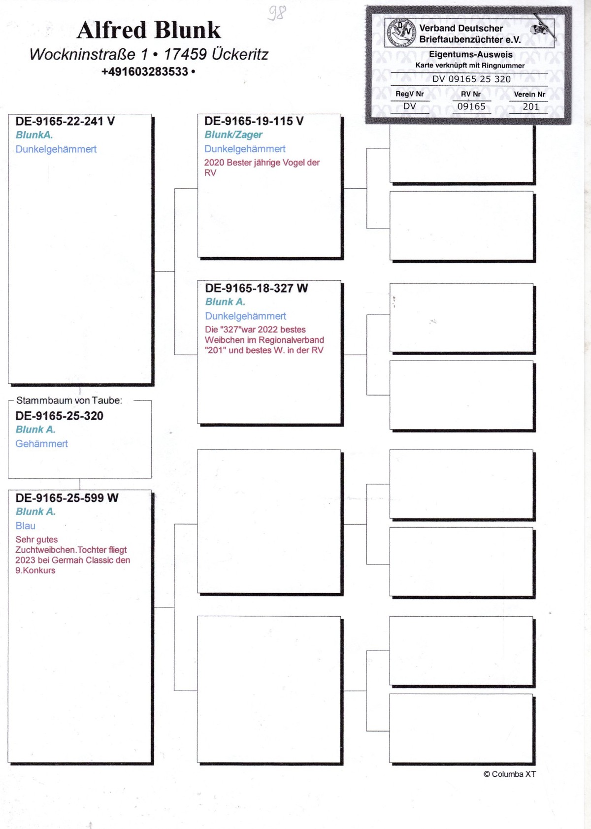 OLR German Classic 2025 Gołąb brał udział w lotach na OLR German Classic. Wyniki lotowe dostępne na stronie internetowej. Szczegóły pochodzenia w rodowodzie. Gołąb znajduje się w Polsce, można go obejrzeć w miejscowości Zblewo (woj. pomorskie), po wcześniejszym kontakcie telefonicznym. Więcej informacji o gołębiu i transporcie pod nr tel.: 511 607 710.