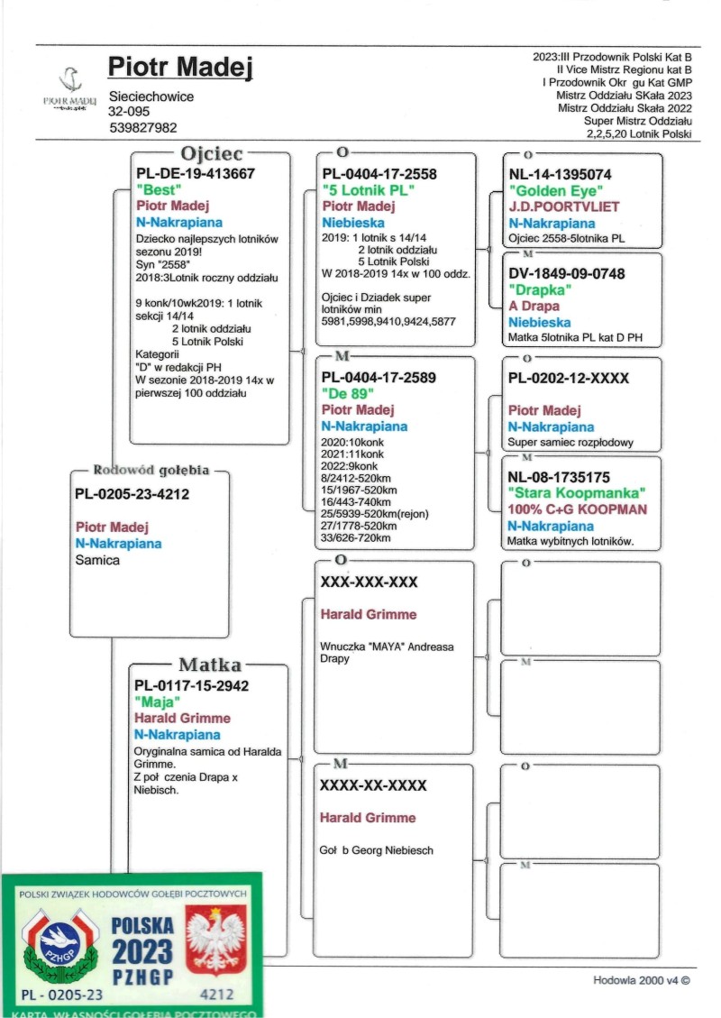 Oryginalny gołąb z hodowli Piotra Madeja. Szczegóły pochodzenia w rodowodzie. Więcej informacji pod nr tel.: 516467223