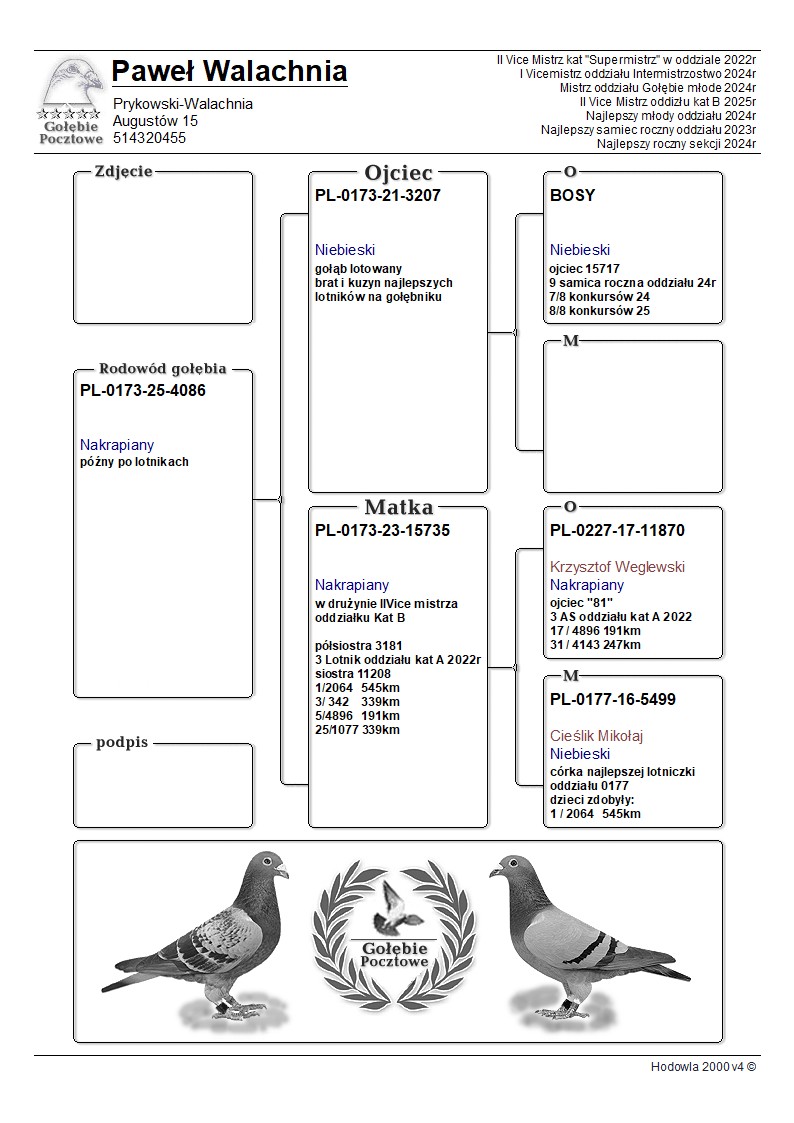 Oryginalny gołąb z hodowli Prykowski-Walachnia. Gołąb po wdowcach. Samica mocnej budowy. Matka jest w drużynie II Vice Mistrza oddziałku kat B, córka bazowego rozpłodowca od Krzysztofa Węglewskiego. Ojciec jest bratem i kuzynem wielu czołowych lotników. Szczegóły pochodzenia w rodowodzie. Więcej informacji pod nr tel.: 514 320 455
