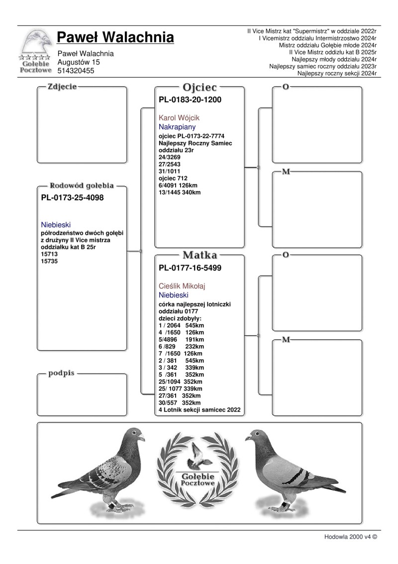 Oryginalny gołąb z hodowli Prykowski-Walachnia. Półsiostra najlepszego roczniaka oddziału. Od strony matki wnuczka wspaniałej lotniczki Mikołaja Cieślika. Szczegóły pochodzenia w rodowodzie. Więcej informacji pod nr tel.: 514 320 455