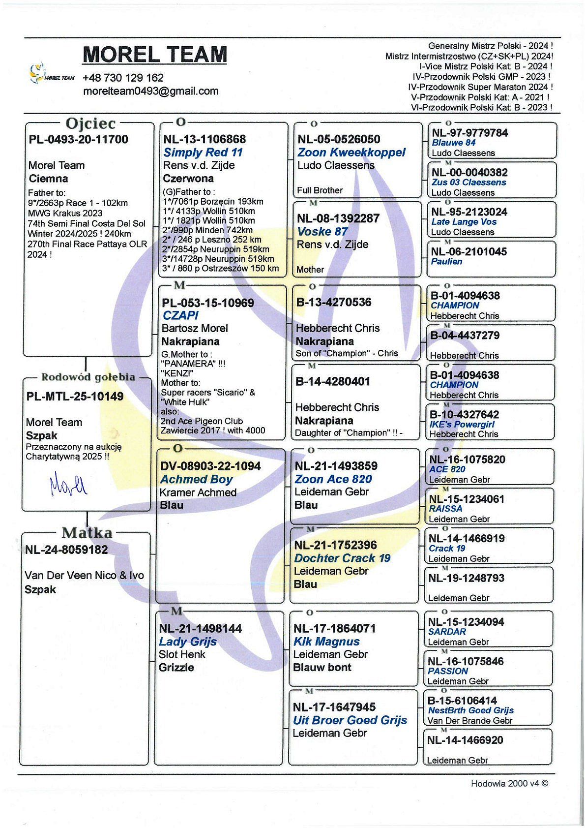 oryg. Morel Team Aukcja charytatywna na rzecz Poli Bekier. Całkowity dochód ze sprzedaży gołębi zostanie przekazany na rzecz fundacji Poli Bekier na jej leczenie. Więcej informacji o oferowanym gołębiu u jego hodowcy (telefon na rodowodzie). Wszelkie inne informacje o płatności i transporcie gołębi pod nr telefonu 605 165 333 (Dariusz Czaiński).