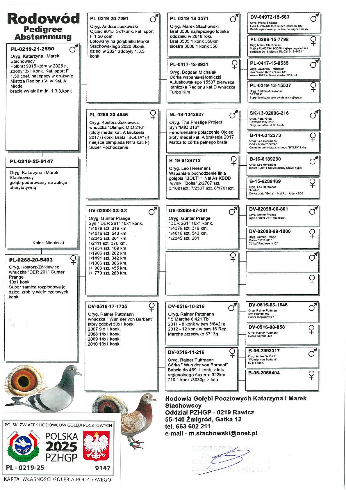 oryg. Stachowscy Katarzyna & Marek Aukcja charytatywna na rzecz Poli Bekier. Całkowity dochód ze sprzedaży gołębi zostanie przekazany na rzecz fundacji Poli Bekier na jej leczenie. Więcej informacji o oferowanym gołębiu u jego hodowcy (telefon na rodowodzie). Wszelkie inne informacje o płatności i transporcie gołębi pod nr telefonu 605 165 333 (Dariusz Czaiński).