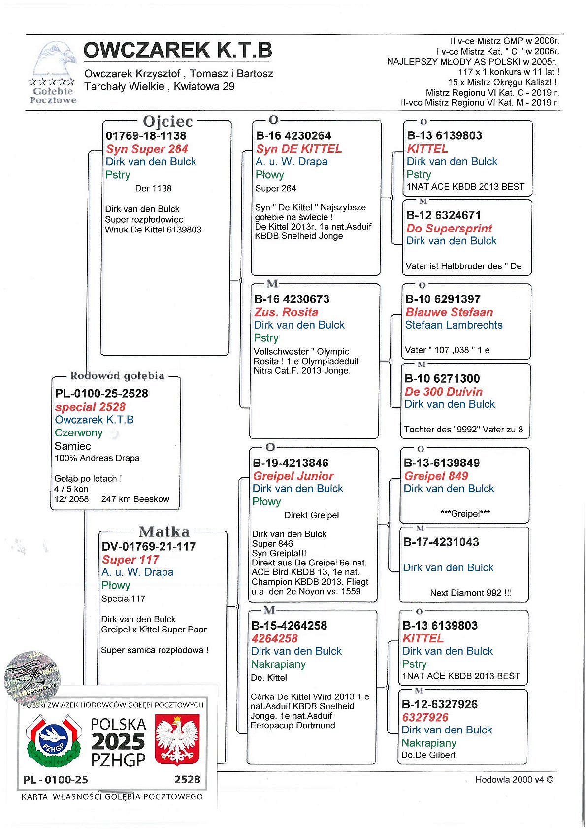 oryg. Owczarek K. T. B. Aukcja charytatywna na rzecz Poli Bekier. Całkowity dochód ze sprzedaży gołębi zostanie przekazany na rzecz fundacji Poli Bekier na jej leczenie. Więcej informacji o oferowanym gołębiu u jego hodowcy (telefon na rodowodzie). Wszelkie inne informacje o płatności i transporcie gołębi pod nr telefonu 605 165 333 (Dariusz Czaiński).