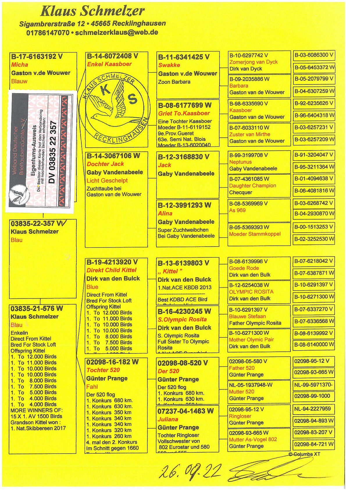 oryg. Schmelzer Klaus Aukcja charytatywna na rzecz Poli Bekier. Całkowity dochód ze sprzedaży gołębi zostanie przekazany na rzecz fundacji Poli Bekier na jej leczenie. Więcej informacji o oferowanym gołębiu u jego hodowcy (telefon na rodowodzie). Wszelkie inne informacje o płatności i transporcie gołębi pod nr telefonu 605 165 333 (Dariusz Czaiński).