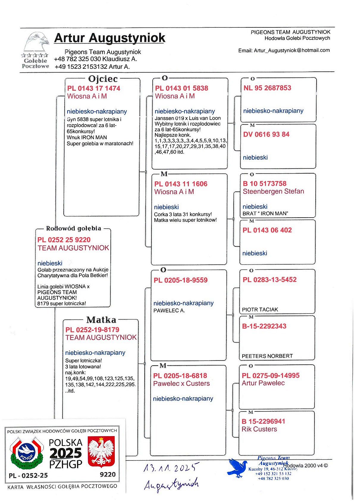 oryg. Augustyniok Artur Aukcja charytatywna na rzecz Poli Bekier. Całkowity dochód ze sprzedaży gołębi zostanie przekazany na rzecz fundacji Poli Bekier na jej leczenie. Więcej informacji o oferowanym gołębiu u jego hodowcy (telefon na rodowodzie). Wszelkie inne informacje o płatności i transporcie gołębi pod nr telefonu 605 165 333 (Dariusz Czaiński).