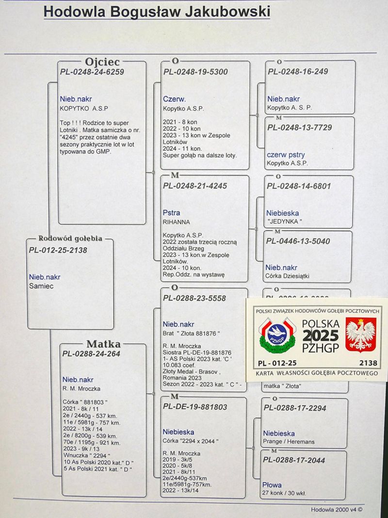 Ojciec młodego to syn super lotników w hodowli A.S.P.Kopytko.Matka to córka super lotniczki "803" w hodowli R.M.Mroczka. Szczegóły w zamieszczonym rodowodzie.