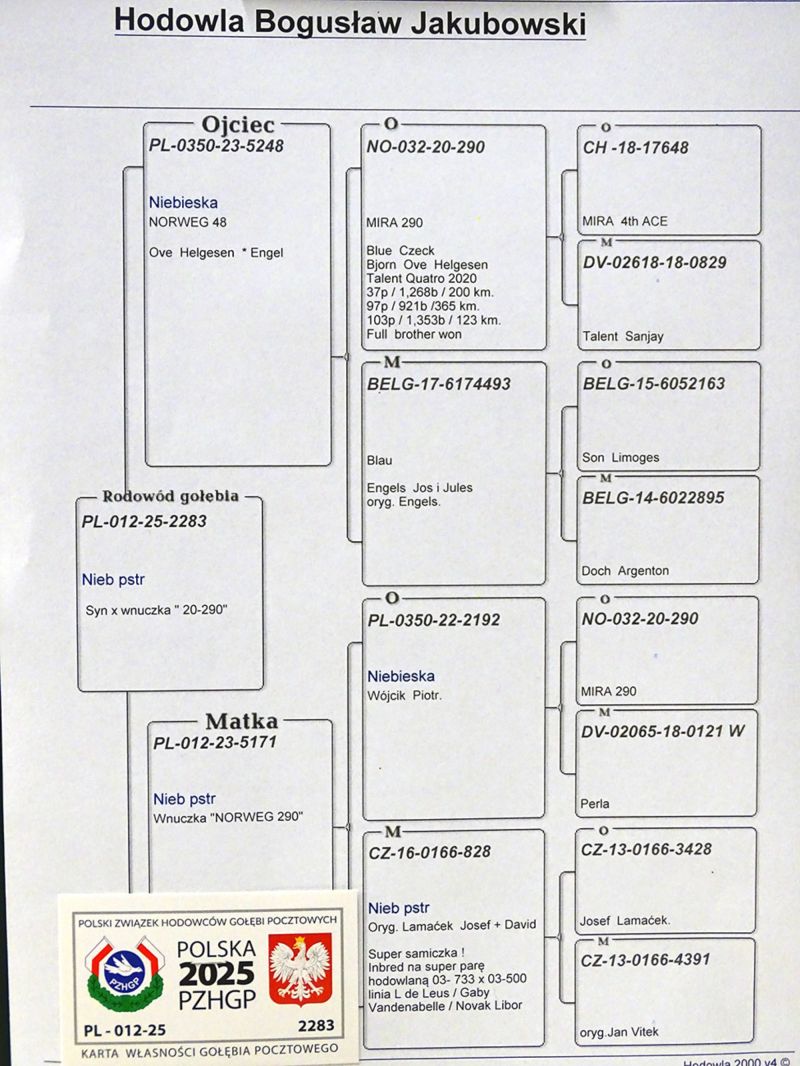 Młody wychowany w bliskim pokrewieństwie syn x wnuczka "290". Młode z tego połączenia bardzo dobrze spisały się w lotach.Szczegóły w zamieszczonym rodowodzie.