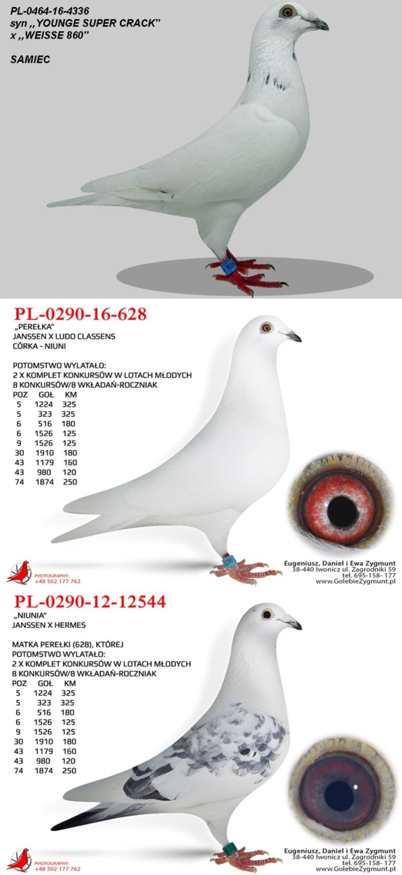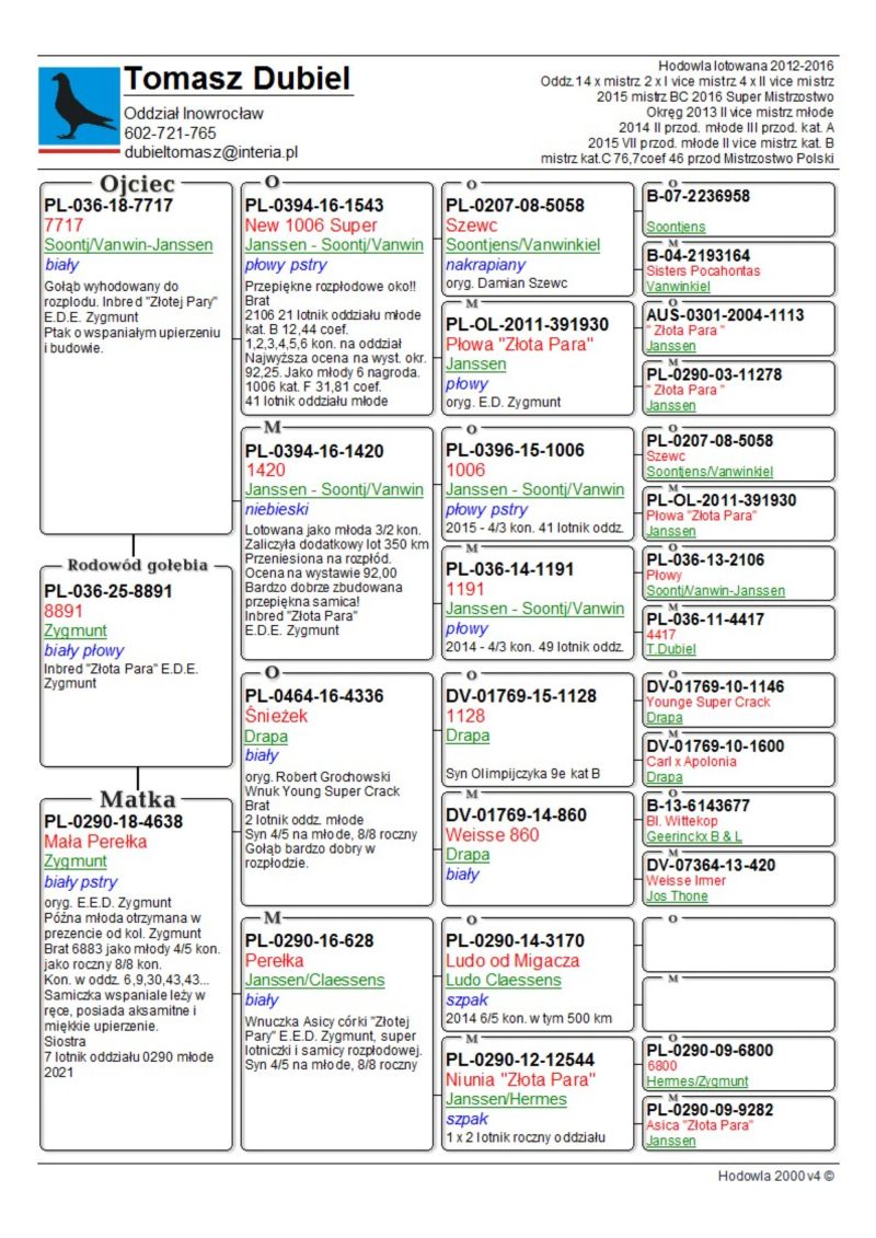 Samiczka. Para ta wydała dużo dobrych gołębi. wielokrotnie hodowcy wracali po ptaki z tej pary. Córka "Złotej Pary" E.D.E. Zygmunt w połączeniu z super samcem od Damiana Szewca z linii olimpijki kat. C „Pocahontas” Jefa Vanwilkel dały mi wybitne lotniki i gołębie rozpłodowe. Ptaki te zdobyły u mnie wiele czołowych nagród w lotach w różnych kategoriach, oraz na wystawach. Samiczka z „moich Zygmuntów” jest babką 1 lotnika oddziału 2024 i 5 lotnika oddziału 2023 u rodziny Zygmunt. W 2025 samczyk z tych gołębi wydał 12 gołębia z finału na WG Carpati. ****************************************** Moje stado opiera się na ptakach które w latach 2012-2016 pozwoliły mi wygrywać w oddziale i okręgu w różnych kategoriach, lecąc w 2 różnych oddziałach 036 i 0394. Najważniejsze osiągnięcia to Mistrz okręgu kat. C 49 miejsce w Polsce, II vice Mistrz okręgu kat. B i młode, Super Mistrz Oddziału. Wszystkie wyniki dokładnie opisane na końcu aukcji. Do lotowania wróciłem „na chwilę” w 2021 r. na nowym miejscu zamieszkania w bardzo ciężkim sezonie 3 x vice Mistrz Oddziału gołębi młodych. 2,5,11,16,19,22,23,27,28,40 pozycje w klasyfikacji lotników. 3 x Mistrz sekcji oraz XIII przodownika okręgu Bydgoszcz. Zacząłem też lotowanie na WG wysyłając po kilka sztuk na sezon. 2021 – konkursy na finałach na WG Krakus i Super Gołąb, 2022 - 14 miejsce Extra Finał 518 km WG Super Gołąb, 2023 – 11 miejsce Finał 502 km WG Bojano. 2024 - 4 miejsce Półfinał WG Tatry, WG Bojano 4 miejsce lot konkursowy, 34 miejsce Półfinał, 17 miejsce Drużyna, 54, 78, 79, 81 lotnik. Po moich gołębiach w 2024 ptaki wylatały: po pełnej parze 68 miejsce Finał Super Gołąb, po samcu 8 miejsce Extra Finał WG Warmia, po samicy 16 miejsce Finał WG Roztocze, po samcu 3 AS długi dystans i 7 miejsce Extra Finał MWG Giewont. 2025 31 lotnik Derby Carmelo Yupi, 43 miejsce Extra Finał WG Tatry, 12 miejsce Finał WG Carpatia, 40 miejsce Finał WG Krakus (56 seria na 849 hodowców 2/2 w konkursie z 3 wysłanych ptaków), po samicy ode mnie 24 miejsce Finał Corabia One Loft Race. ********************** Wszystkie gołębie przyjęły komplet szczepień(Pharmavac, salmovir + ospa). Więcej informacji w rodowodach, zapraszam też do kontaktu telefonicznego, mailowego bądź WhatsApp. ********************* TRANSPORT, ptaki zostaną dostarczone transportem prywatnym na początku grudnia, cena 1-2 szt. 100 zł, 3-6 szt. 150 zł, 7 i więcej 200 zł. Koszty transportu płatne kierowcy, za gołębie kierowcy bądź na konto, jak wygodniej. Istnieje również możliwość wcześniejszej wysyłki kurierskiej w cenie 150 zł do 6 szt. Zapraszam również do odbioru osobistego.