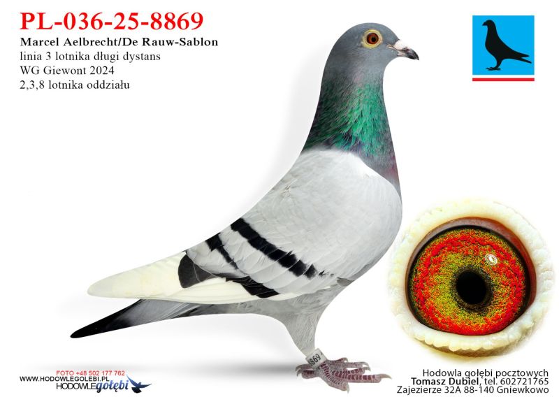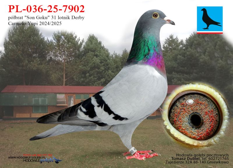 Samiec. Córka "Złotej Pary" E.D.E. Zygmunt w połączeniu z super samcem od Damiana Szewca z linii olimpijki kat. C „Pocahontas” Jefa Vanwilkel dały mi wybitne lotniki i gołębie rozpłodowe. Ptaki te zdobyły u mnie wiele czołowych nagród w lotach w różnych kategoriach, oraz na wystawach. Samiczka z „moich Zygmuntów” jest babką 1 lotnika oddziału 2024 i 5 lotnika oddziału 2023 u rodziny Zygmunt. W 2025 samczyk z tych gołębi wydał 12 gołębia z finału na WG Carpati. ****************************************** Moje stado opiera się na ptakach które w latach 2012-2016 pozwoliły mi wygrywać w oddziale i okręgu w różnych kategoriach, lecąc w 2 różnych oddziałach 036 i 0394. Najważniejsze osiągnięcia to Mistrz okręgu kat. C 49 miejsce w Polsce, II vice Mistrz okręgu kat. B i młode, Super Mistrz Oddziału. Wszystkie wyniki dokładnie opisane na końcu aukcji. Do lotowania wróciłem „na chwilę” w 2021 r. na nowym miejscu zamieszkania w bardzo ciężkim sezonie 3 x vice Mistrz Oddziału gołębi młodych. 2,5,11,16,19,22,23,27,28,40 pozycje w klasyfikacji lotników. 3 x Mistrz sekcji oraz XIII przodownika okręgu Bydgoszcz. Zacząłem też lotowanie na WG wysyłając po kilka sztuk na sezon. 2021 – konkursy na finałach na WG Krakus i Super Gołąb, 2022 - 14 miejsce Extra Finał 518 km WG Super Gołąb, 2023 – 11 miejsce Finał 502 km WG Bojano. 2024 - 4 miejsce Półfinał WG Tatry, WG Bojano 4 miejsce lot konkursowy, 34 miejsce Półfinał, 17 miejsce Drużyna, 54, 78, 79, 81 lotnik. Po moich gołębiach w 2024 ptaki wylatały: po pełnej parze 68 miejsce Finał Super Gołąb, po samcu 8 miejsce Extra Finał WG Warmia, po samicy 16 miejsce Finał WG Roztocze, po samcu 3 AS długi dystans i 7 miejsce Extra Finał MWG Giewont. 2025 31 lotnik Derby Carmelo Yupi, 43 miejsce Extra Finał WG Tatry, 12 miejsce Finał WG Carpatia, 40 miejsce Finał WG Krakus (56 seria na 849 hodowców 2/2 w konkursie z 3 wysłanych ptaków), po samicy ode mnie 24 miejsce Finał Corabia One Loft Race. ********************** Wszystkie gołębie przyjęły komplet szczepień(Pharmavac, salmovir + ospa). Więcej informacji w rodowodach, zapraszam też do kontaktu telefonicznego, mailowego bądź WhatsApp. ********************* TRANSPORT, ptaki zostaną dostarczone transportem prywatnym w połowie grudnia, cena 1-2 szt. 100 zł, 3-6 szt. 150 zł, 7 i więcej 200 zł. Koszty transportu płatne kierowcy, za gołębie kierowcy bądź na konto, jak wygodniej. Istnieje również możliwość wcześniejszej wysyłki kurierskiej w cenie 150 zł do 6 szt. Zapraszam również do odbioru osobistego.