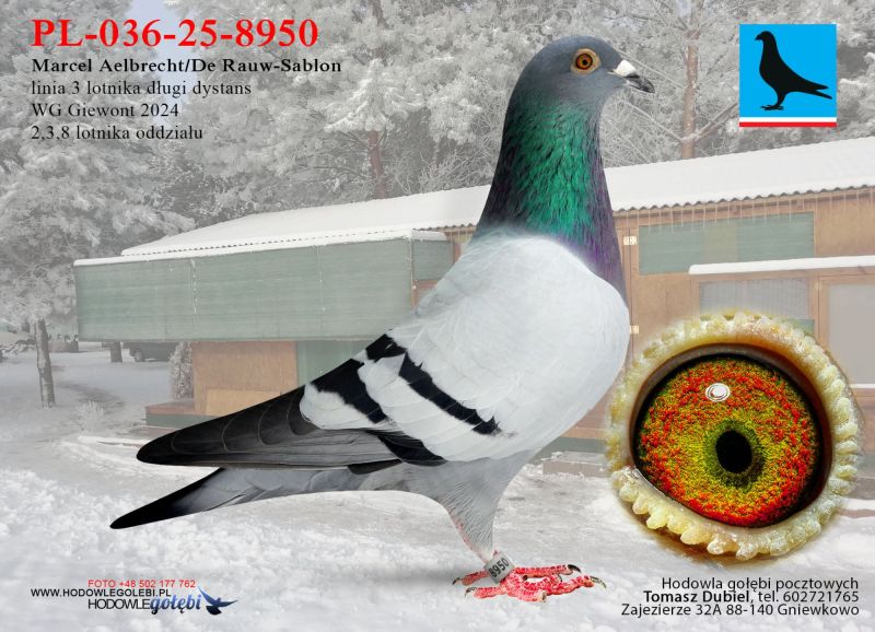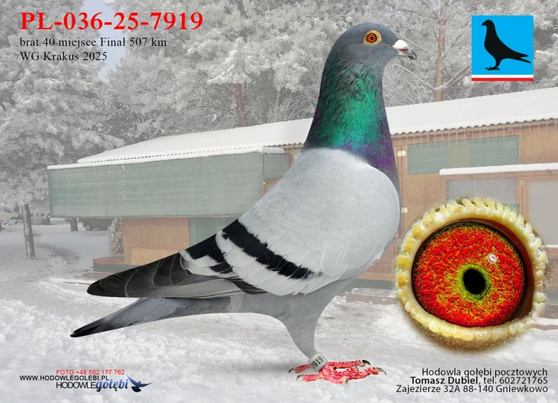 Prawdopodobnie Samiec. Matka młodego wydała najwięcej dobrych rozpłodowców w porównaniu ze swoim rodzeństwem. Ptaki z linii 550 x 107. Po gołębiach tych posiadam super gołębie rozpłodowe. W krótkim czasie ich dzieci jak i one same dały mi super lotniki, między innymi 2 i 3 lotnika oddziału, oraz wiele innych wartościowych lotników w lotach młodych i starych. Przepiękne gołębie na wymagające loty. Najlepsze umięśnienie, super budowa i aksamitne upierzenie. Do tego super wyniki na WG. U mnie WG Bojano 2023 wnuk 12 miejsce półfinał, 2024 wnuk 34 miejsce półfinał. U innych hodowców 2022 roku córka 107 wydała 4 gołębia z finału WG Mazury! W 2024 syn 107 x 550 wydał 3 ASA długi dystans, 7 miejsce Super Finał 515 km!!! ****************************************** Moje stado opiera się na ptakach które w latach 2012-2016 pozwoliły mi wygrywać w oddziale i okręgu w różnych kategoriach, lecąc w 2 różnych oddziałach 036 i 0394. Najważniejsze osiągnięcia to Mistrz okręgu kat. C 49 miejsce w Polsce, II vice Mistrz okręgu kat. B i młode, Super Mistrz Oddziału. Wszystkie wyniki dokładnie opisane na końcu aukcji. Do lotowania wróciłem „na chwilę” w 2021 r. na nowym miejscu zamieszkania w bardzo ciężkim sezonie 3 x vice Mistrz Oddziału gołębi młodych. 2,5,11,16,19,22,23,27,28,40 pozycje w klasyfikacji lotników. 3 x Mistrz sekcji oraz XIII przodownika okręgu Bydgoszcz. Zacząłem też lotowanie na WG wysyłając po kilka sztuk na sezon. 2021 – konkursy na finałach na WG Krakus i Super Gołąb, 2022 - 14 miejsce Extra Finał 518 km WG Super Gołąb, 2023 – 11 miejsce Finał 502 km WG Bojano. 2024 - 4 miejsce Półfinał WG Tatry, WG Bojano 4 miejsce lot konkursowy, 34 miejsce Półfinał, 17 miejsce Drużyna, 54, 78, 79, 81 lotnik. Po moich gołębiach w 2024 ptaki wylatały: po pełnej parze 68 miejsce Finał Super Gołąb, po samcu 8 miejsce Extra Finał WG Warmia, po samicy 16 miejsce Finał WG Roztocze, po samcu 3 AS długi dystans i 7 miejsce Extra Finał MWG Giewont. 2025 31 lotnik Derby Carmelo Yupi, 43 miejsce Extra Finał WG Tatry, 12 miejsce Finał WG Carpatia, 40 miejsce Finał WG Krakus (56 seria na 849 hodowców 2/2 w konkursie z 3 wysłanych ptaków), po samicy ode mnie 24 miejsce Finał Corabia One Loft Race. ********************** Wszystkie gołębie przyjęły komplet szczepień(Pharmavac, salmovir + ospa). Więcej informacji w rodowodach, zapraszam też do kontaktu telefonicznego, mailowego bądź WhatsApp. ********************* TRANSPORT, ptaki zostaną dostarczone transportem prywatnym w połowie grudnia, cena 1-2 szt. 100 zł, 3-6 szt. 150 zł, 7 i więcej 200 zł. Koszty transportu płatne kierowcy, za gołębie kierowcy bądź na konto, jak wygodniej. Istnieje również możliwość wcześniejszej wysyłki kurierskiej w cenie 150 zł do 6 szt. Zapraszam również do odbioru osobistego.