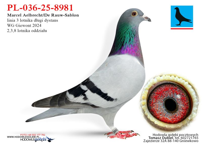 Prawdopodobnie Samica. z linii 550 x 107. Po gołębiach tych posiadam super gołębie rozpłodowe. W krótkim czasie ich dzieci jak i one same dały mi super lotniki, między innymi 2 i 3 lotnika oddziału, oraz wiele innych wartościowych lotników w lotach młodych i starych. Przepiękne gołębie na wymagające loty. Najlepsze umięśnienie, super budowa i aksamitne upierzenie. Do tego super wyniki na WG. U mnie WG Bojano 2023 wnuk 12 miejsce półfinał, 2024 wnuk 34 miejsce półfinał. U innych hodowców 2022 roku córka 107 wydała 4 gołębia z finału WG Mazury! W 2024 syn 107 x 550 wydał 3 ASA długi dystans, 7 miejsce Super Finał 515 km!!! ****************************************** Moje stado opiera się na ptakach które w latach 2012-2016 pozwoliły mi wygrywać w oddziale i okręgu w różnych kategoriach, lecąc w 2 różnych oddziałach 036 i 0394. Najważniejsze osiągnięcia to Mistrz okręgu kat. C 49 miejsce w Polsce, II vice Mistrz okręgu kat. B i młode, Super Mistrz Oddziału. Wszystkie wyniki dokładnie opisane na końcu aukcji. Do lotowania wróciłem „na chwilę” w 2021 r. na nowym miejscu zamieszkania w bardzo ciężkim sezonie 3 x vice Mistrz Oddziału gołębi młodych. 2,5,11,16,19,22,23,27,28,40 pozycje w klasyfikacji lotników. 3 x Mistrz sekcji oraz XIII przodownika okręgu Bydgoszcz. Zacząłem też lotowanie na WG wysyłając po kilka sztuk na sezon. 2021 – konkursy na finałach na WG Krakus i Super Gołąb, 2022 - 14 miejsce Extra Finał 518 km WG Super Gołąb, 2023 – 11 miejsce Finał 502 km WG Bojano. 2024 - 4 miejsce Półfinał WG Tatry, WG Bojano 4 miejsce lot konkursowy, 34 miejsce Półfinał, 17 miejsce Drużyna, 54, 78, 79, 81 lotnik. Po moich gołębiach w 2024 ptaki wylatały: po pełnej parze 68 miejsce Finał Super Gołąb, po samcu 8 miejsce Extra Finał WG Warmia, po samicy 16 miejsce Finał WG Roztocze, po samcu 3 AS długi dystans i 7 miejsce Extra Finał MWG Giewont. 2025 31 lotnik Derby Carmelo Yupi, 43 miejsce Extra Finał WG Tatry, 12 miejsce Finał WG Carpatia, 40 miejsce Finał WG Krakus (56 seria na 849 hodowców 2/2 w konkursie z 3 wysłanych ptaków), po samicy ode mnie 24 miejsce Finał Corabia One Loft Race. ********************** Wszystkie gołębie przyjęły komplet szczepień(Pharmavac, salmovir + ospa). Więcej informacji w rodowodach, zapraszam też do kontaktu telefonicznego, mailowego bądź WhatsApp. ********************* TRANSPORT, ptaki zostaną dostarczone transportem prywatnym w połowie grudnia, cena 1-2 szt. 100 zł, 3-6 szt. 150 zł, 7 i więcej 200 zł. Koszty transportu płatne kierowcy, za gołębie kierowcy bądź na konto, jak wygodniej. Istnieje również możliwość wcześniejszej wysyłki kurierskiej w cenie 150 zł do 6 szt. Zapraszam również do odbioru osobistego.