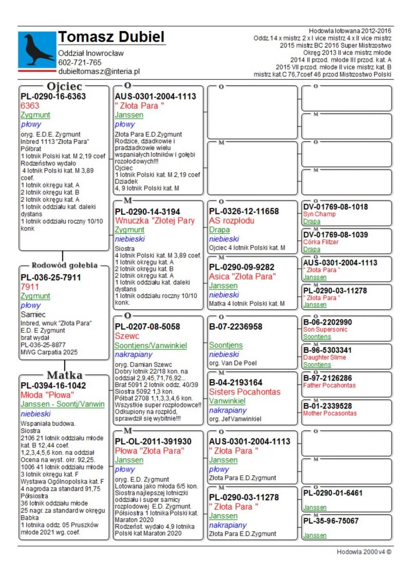 Samiec. Brat oferowanego samczyka wydał mi w tym roku 12 gołębia z finału pod wiatr na WG Carpati!! Ojcem samczyka jest oryginalny syn i inbred "Złotej Pary" E.D. E Zygmunt Polecam te ptaki. Córka "Złotej Pary" E.D.E. Zygmunt w połączeniu z super samcem od Damiana Szewca z linii olimpijki kat. C „Pocahontas” Jefa Vanwilkel dały mi wybitne lotniki i gołębie rozpłodowe. Ptaki te zdobyły u mnie wiele czołowych nagród w lotach w różnych kategoriach, oraz na wystawach. Samiczka z „moich Zygmuntów” jest babką 1 lotnika oddziału 2024 i 5 lotnika oddziału 2023 u rodziny Zygmunt. W 2025 samczyk z tych gołębi wydał 12 gołębia z finału na WG Carpati. ****************************************** Moje stado opiera się na ptakach które w latach 2012-2016 pozwoliły mi wygrywać w oddziale i okręgu w różnych kategoriach, lecąc w 2 różnych oddziałach 036 i 0394. Najważniejsze osiągnięcia to Mistrz okręgu kat. C 49 miejsce w Polsce, II vice Mistrz okręgu kat. B i młode, Super Mistrz Oddziału. Wszystkie wyniki dokładnie opisane na końcu aukcji. Do lotowania wróciłem „na chwilę” w 2021 r. na nowym miejscu zamieszkania w bardzo ciężkim sezonie 3 x vice Mistrz Oddziału gołębi młodych. 2,5,11,16,19,22,23,27,28,40 pozycje w klasyfikacji lotników. 3 x Mistrz sekcji oraz XIII przodownika okręgu Bydgoszcz. Zacząłem też lotowanie na WG wysyłając po kilka sztuk na sezon. 2021 – konkursy na finałach na WG Krakus i Super Gołąb, 2022 - 14 miejsce Extra Finał 518 km WG Super Gołąb, 2023 – 11 miejsce Finał 502 km WG Bojano. 2024 - 4 miejsce Półfinał WG Tatry, WG Bojano 4 miejsce lot konkursowy, 34 miejsce Półfinał, 17 miejsce Drużyna, 54, 78, 79, 81 lotnik. Po moich gołębiach w 2024 ptaki wylatały: po pełnej parze 68 miejsce Finał Super Gołąb, po samcu 8 miejsce Extra Finał WG Warmia, po samicy 16 miejsce Finał WG Roztocze, po samcu 3 AS długi dystans i 7 miejsce Extra Finał MWG Giewont. 2025 31 lotnik Derby Carmelo Yupi, 43 miejsce Extra Finał WG Tatry, 12 miejsce Finał WG Carpatia, 40 miejsce Finał WG Krakus (56 seria na 849 hodowców 2/2 w konkursie z 3 wysłanych ptaków), po samicy ode mnie 24 miejsce Finał Corabia One Loft Race. ********************** Wszystkie gołębie przyjęły komplet szczepień(Pharmavac, salmovir + ospa). Więcej informacji w rodowodach, zapraszam też do kontaktu telefonicznego, mailowego bądź WhatsApp. ********************* TRANSPORT, ptaki zostaną dostarczone transportem prywatnym na początku grudnia, cena 1-2 szt. 100 zł, 3-6 szt. 150 zł, 7 i więcej 200 zł. Koszty transportu płatne kierowcy, za gołębie kierowcy bądź na konto, jak wygodniej. Istnieje również możliwość wcześniejszej wysyłki kurierskiej w cenie 150 zł do 6 szt. Zapraszam również do odbioru osobistego.