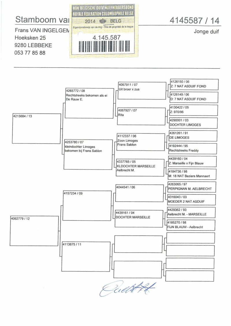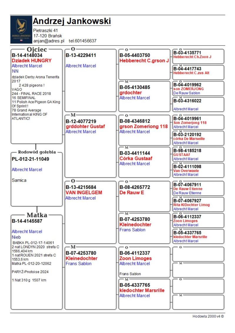 Na aukcji samica z oryginalnych gołębie Marcela Aelbrechta (De Rauw & Sablon), na koszt kupującego istnieje możliwość potwierdzenia pochodzenia, ponieważ rodzice są wpisane do bazy genowej w firmie COBA. Preferowany odbiór osobisty woj. podlaskie, w przypadku wysyłki kurierem odpłatność ok 150 zł. Możliwy odbiór na wystawie Krajowej.