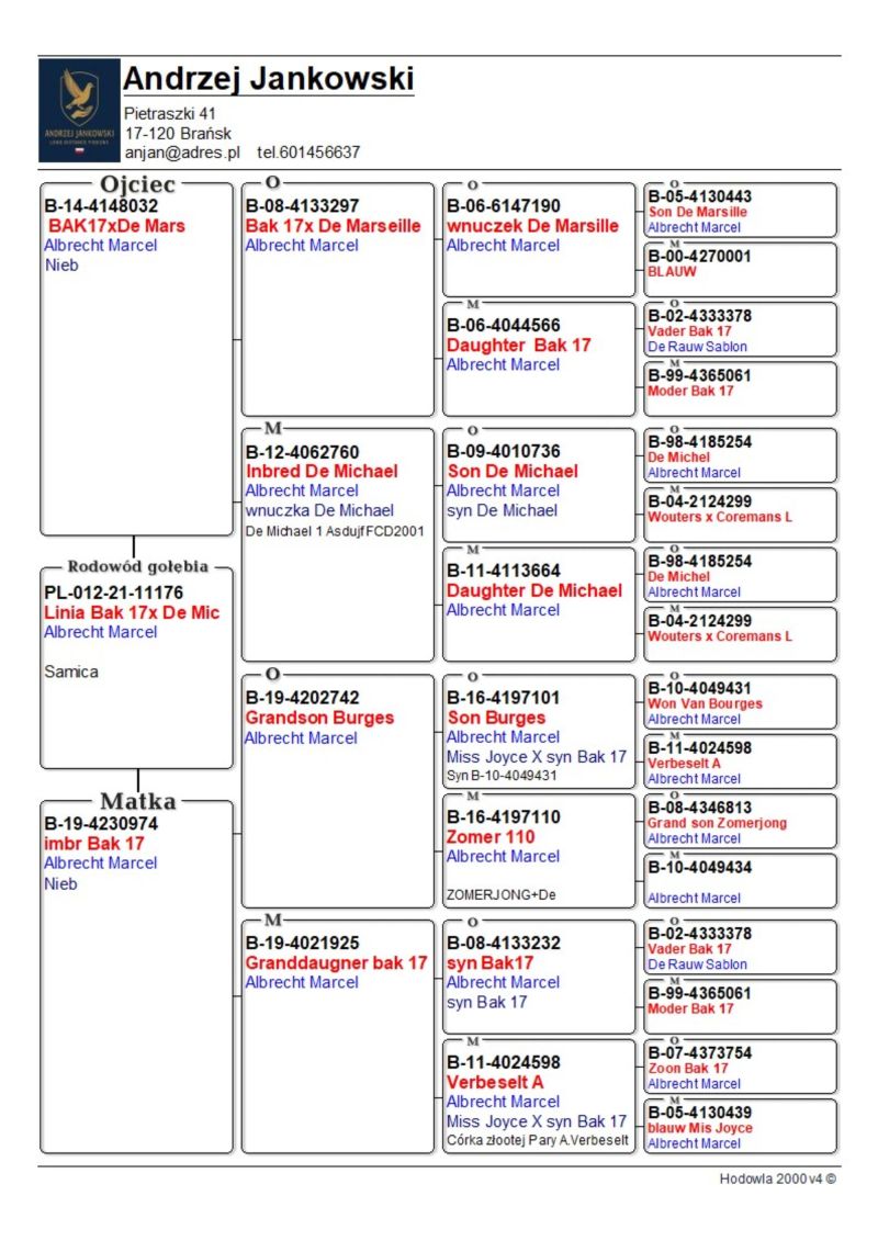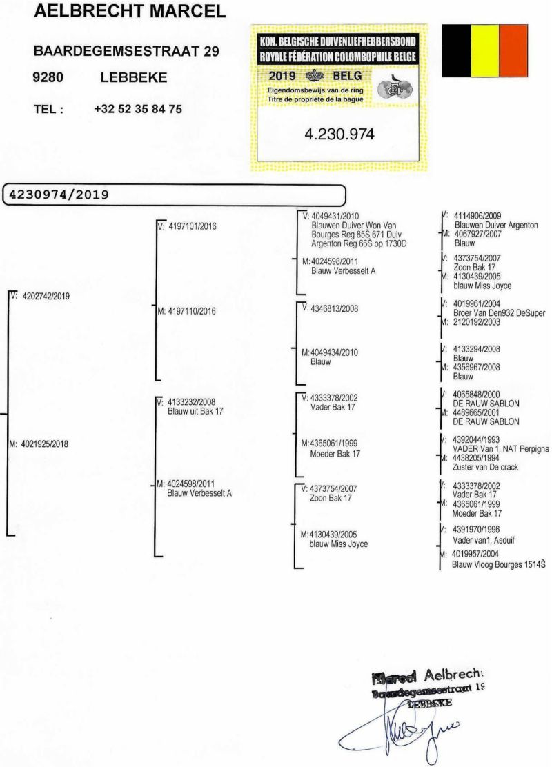 Na aukcji samica z oryginalnych gołębie Marcela Aelbrechta (De Rauw & Sablon), na koszt kupującego istnieje możliwość potwierdzenia pochodzenia, ponieważ rodzice są wpisane do bazy genowej w firmie COBA. Preferowany odbiór osobisty woj. podlaskie, w przypadku wysyłki kurierem odpłatność ok 150 zł.Możliwy odbiór na wystawie Krajowej.