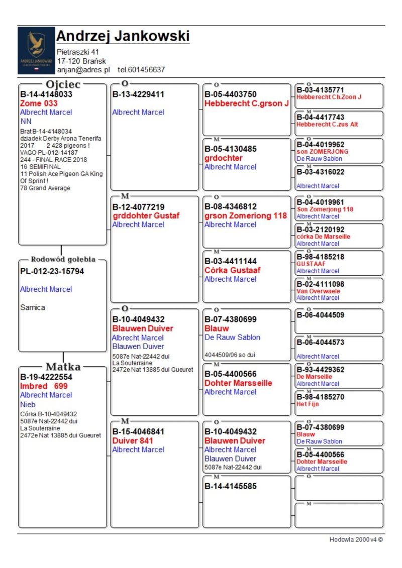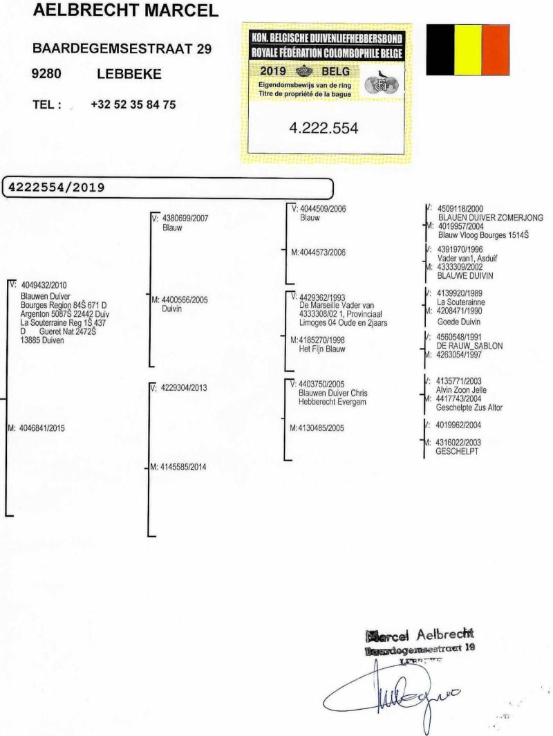 Na aukcji samica z oryginalnych gołębie Marcela Aelbrechta (De Rauw & Sablon), na koszt kupującego istnieje możliwość potwierdzenia pochodzenia, ponieważ rodzice są wpisane do bazy genowej w firmie COBA. Preferowany odbiór osobisty woj. podlaskie, w przypadku wysyłki kurierem odpłatność ok 150 zł.Możliwy odbiór na wystawie Krajowej.