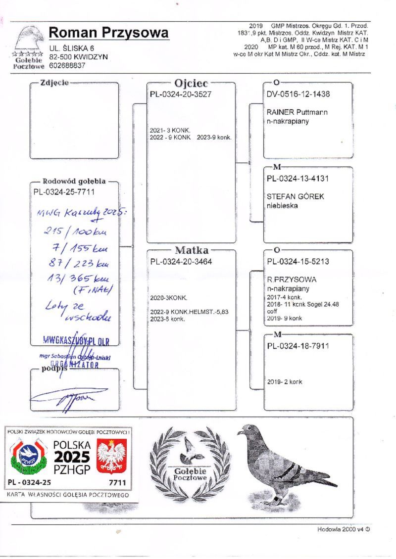 Gołąb (13 MIEJSCE z lotu Finałowego) brał udział w zawodach na Wspólnym Gołębniku KASZUBY. Więcej informacji w rodowodzie i załącznikach. Kontakt do Właściciela Gołębnika tel.601686344 (Sebastian Ostoja-Lniski). Informujemy poza tym, że rozpoczęły się zapisy na sezon 2026. Serdecznie zapraszam do rywalizacji. Uwaga! Koszty związane z transportem pokrywa nabywca gołębia. W zależności od kuriera wynoszą one około 150zł. Preferowany jest odbiór osobisty. Powyżej sylwetki gołębia znajduje się video z jego prezentacją.