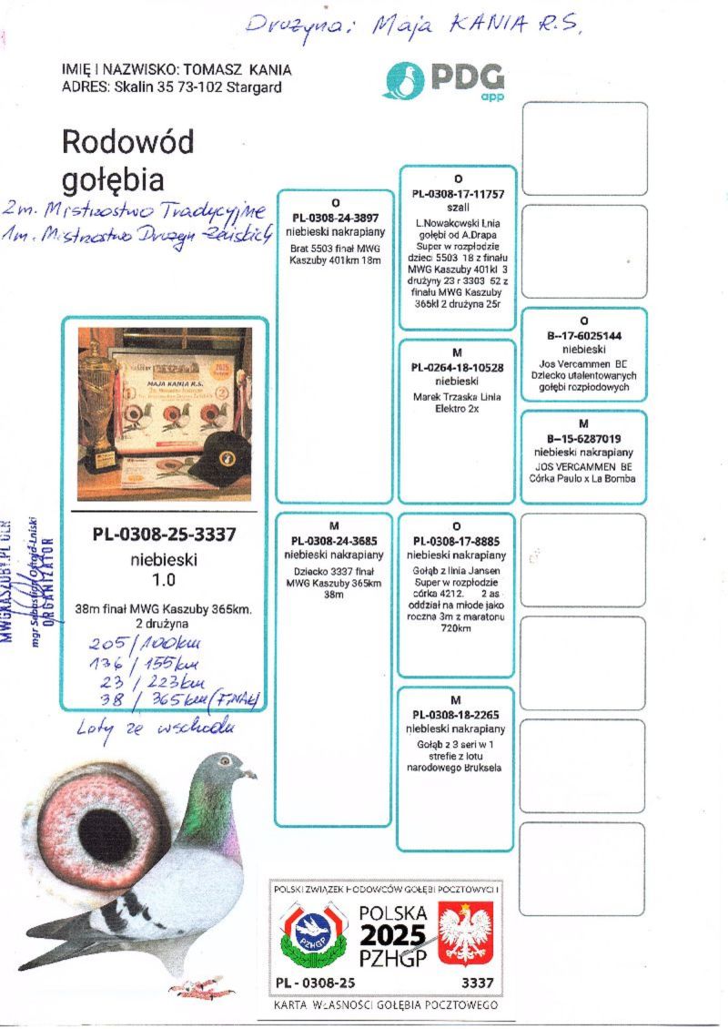 Gołąb (38 MIEJSCE z lotu Finałowego) brał udział w zawodach na Wspólnym Gołębniku KASZUBY. Więcej informacji w rodowodzie i załącznikach. Kontakt do Właściciela Gołębnika tel.601686344 (Sebastian Ostoja-Lniski). Informujemy poza tym, że rozpoczęły się zapisy na sezon 2026. Serdecznie zapraszam do rywalizacji. Uwaga! Koszty związane z transportem pokrywa nabywca gołębia. W zależności od kuriera wynoszą one około 150zł. Preferowany jest odbiór osobisty. Powyżej sylwetki gołębia znajduje się video z jego prezentacją.