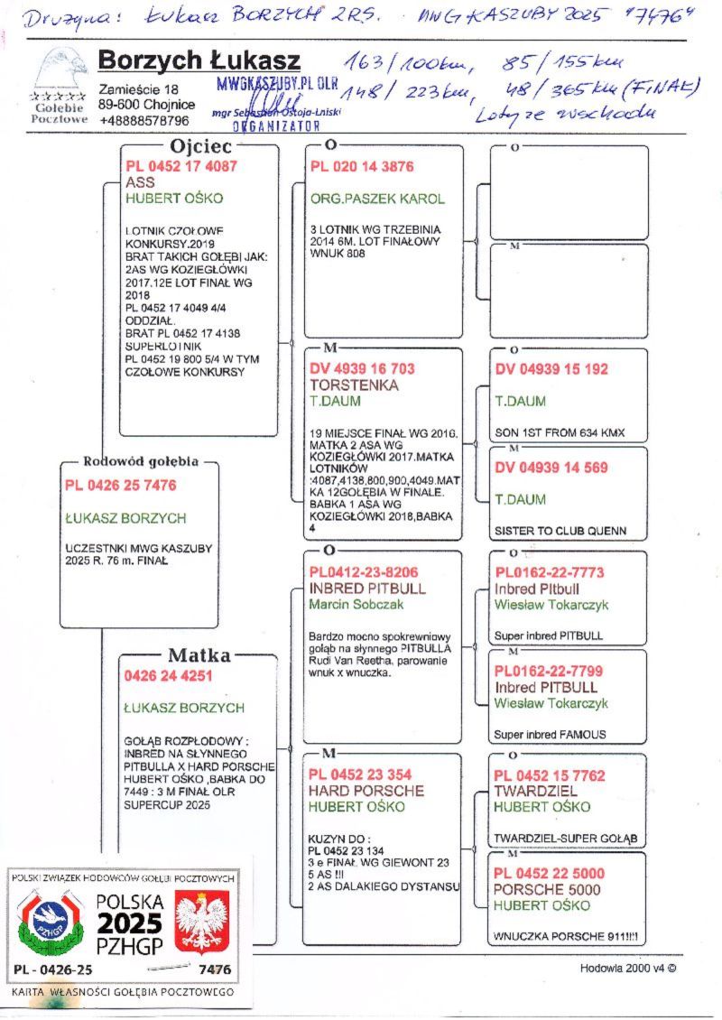 Gołąb (48 MIEJSCE z lotu Finałowego) brał udział w zawodach na Wspólnym Gołębniku KASZUBY. Więcej informacji w rodowodzie i załącznikach. Kontakt do Właściciela Gołębnika tel.601686344 (Sebastian Ostoja-Lniski). Informujemy poza tym, że rozpoczęły się zapisy na sezon 2026. Serdecznie zapraszam do rywalizacji. Uwaga! Koszty związane z transportem pokrywa nabywca gołębia. W zależności od kuriera wynoszą one około 150zł. Preferowany jest odbiór osobisty. Powyżej sylwetki gołębia znajduje się video z jego prezentacją.