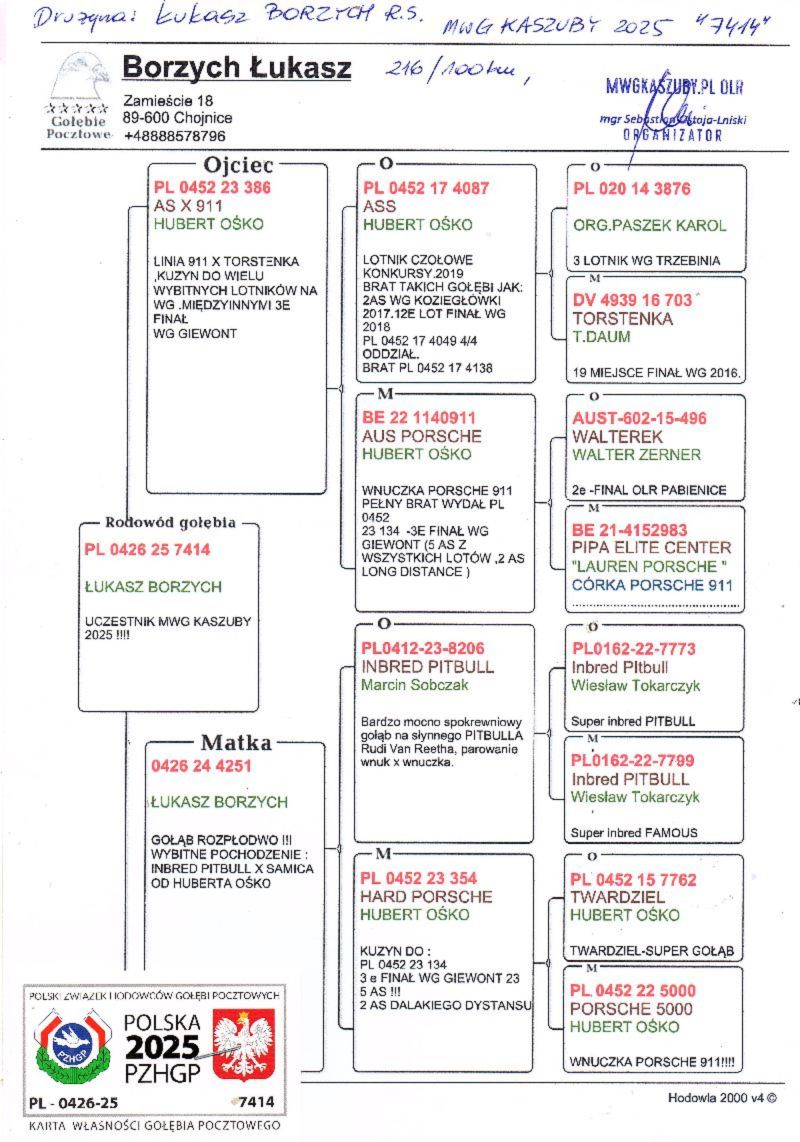 Gołąb brał udział w zawodach na Wspólnym Gołębniku KASZUBY. Więcej informacji w rodowodzie i załącznikach. Kontakt do Właściciela Gołębnika tel.601686344 (Sebastian Ostoja-Lniski). Informujemy poza tym, że rozpoczęły się zapisy na sezon 2026. Serdecznie zapraszam do rywalizacji. Uwaga! Koszty związane z transportem pokrywa nabywca gołębia. W zależności od kuriera wynoszą one około 150zł. Preferowany jest odbiór osobisty. Powyżej sylwetki gołębia znajduje się video z jego prezentacją.