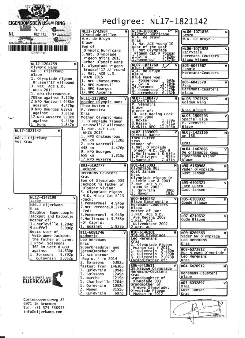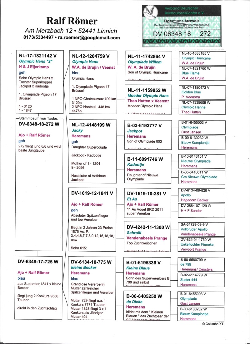 Oryginalny gołąb z hodowli Ralf Romer, wnuczka Olimpic Hans i wnuczka super lotnika jak i rozpłodowca Ralfa Romera. Szczegóły pochodzenia w rodowodzie. Więcej informacji pod nr tel.: 693 857 448 *koszt wysyłki pokrywa kupujacy około 150zł