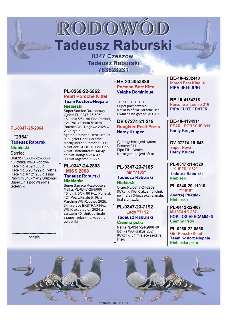 Hodowla skupiona w lotach gołębi na wspólnych gołębnikach z wieloma sukcesami. Zaprasza Państwa do licytacji wartościowego materiału do dalszej hodowli. Proponowany gołąb to linia Hardy Kruger I PEC Porsche 911, brat do 16 As/4058g. MWG Rogowo. Linia moich bazowych par rozpłodowych, wielu kuzynów osiąga sukcesy na wspólnych gołębnikach, i nie tylko. Więcej informacji w rodowodzie oraz pod nr. tel. WYSYŁKA 100ZŁ