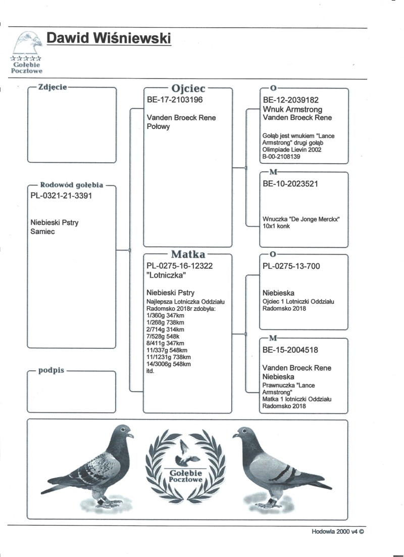 Oryginalny gołąb z hodowli Dawida Wiśniewskiego. Szczegóły pochodzenia w rodowodzie. Więcej informacji pod nr tel.: 693 857 448 *koszt wysyłki pokrywa kupujacy około 150zł