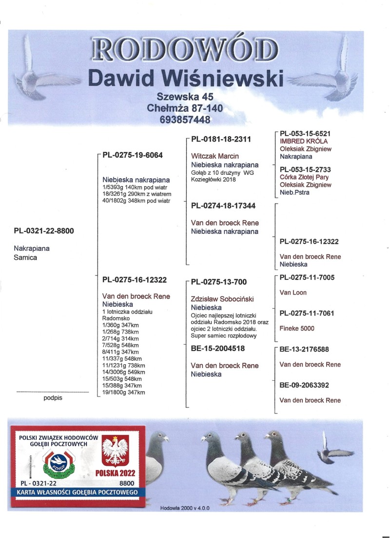 Oryginalny gołąb z hodowli Dawida Wiśniewskiego. Szczegóły pochodzenia w rodowodzie. Więcej informacji pod nr tel.: 693 857 448 *koszt wysyłki pokrywa kupujacy około 150zł