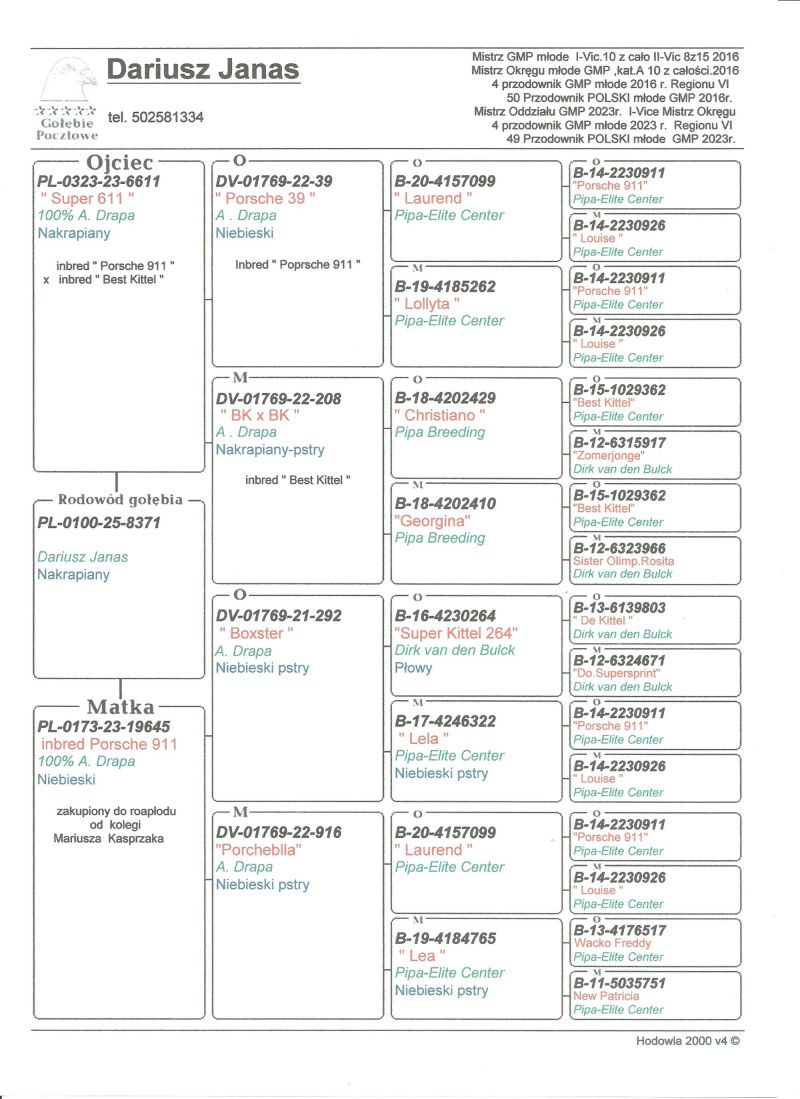Oryginalny gołąb z hodowli Dariusz Janas . Szczegóły pochodzenia w rodowodzie . Więcej informacji pod nr. tel . 502581334 ...... Oferowany gołąb to prawdopodobnie samica ...... Transport firmą kurierską.