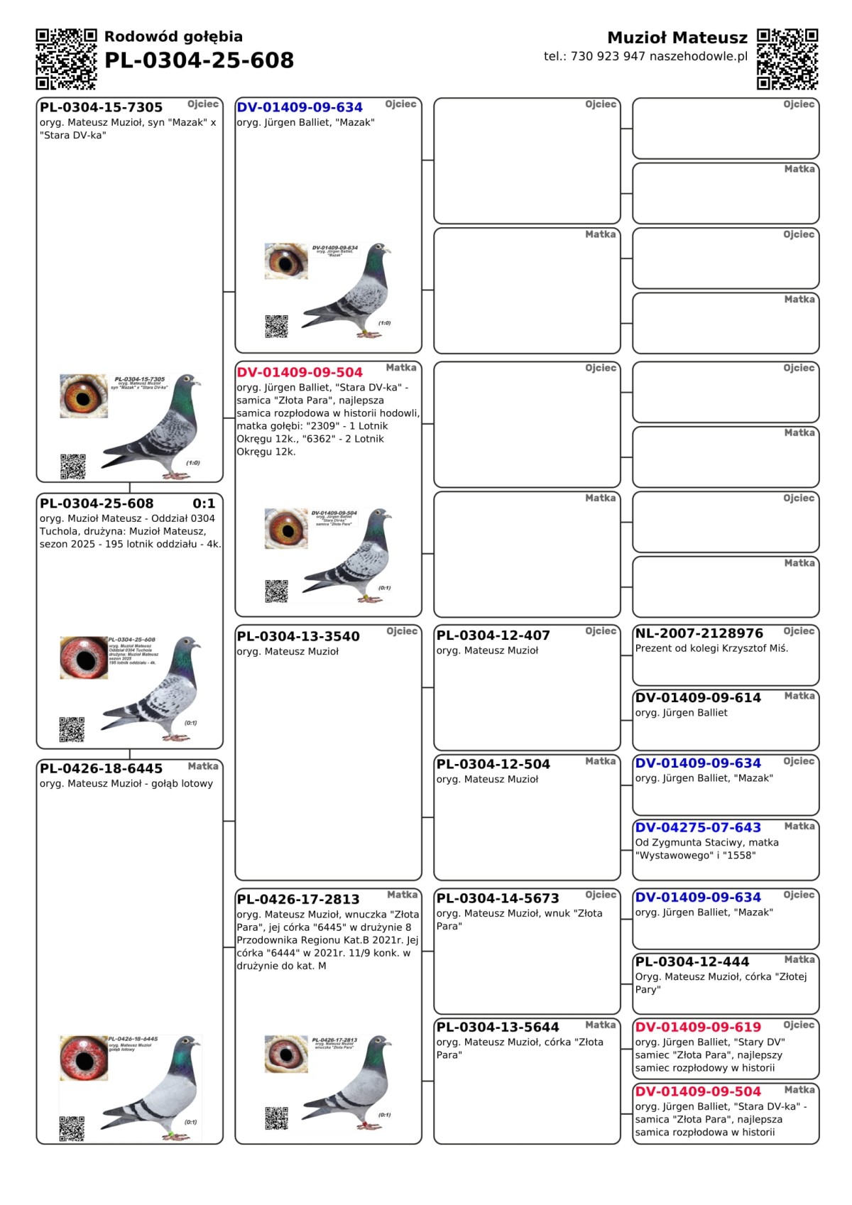 PLGP oryg. Muzioł Mateusz - Oddział 0304 Tuchola, drużyna: Muzioł Mateusz, sezon 2025 - 195 lotnik oddziału - 4k. Gołąb był lotowany w sezonie 2025 w Oddziale PZHGP 0304 Tuchola w drużynie Mateusz Muzioł w ramach Polskiej Ligii Gołębi Pocztowych. Wyniki za poszczególne loty dostępne są w tabeli wyników. Zapewniamy transport gołębi w cenie: od 1 do 6 szt. - 150 PLN i od 7 do 12 szt. 200 PLN. Gołębia można również odebrać osobiście w Tucholi lub na Wystawie Ogólnopolskiej w Katowicach. Więcej informacji u kol. Mateusza Muzioła pod