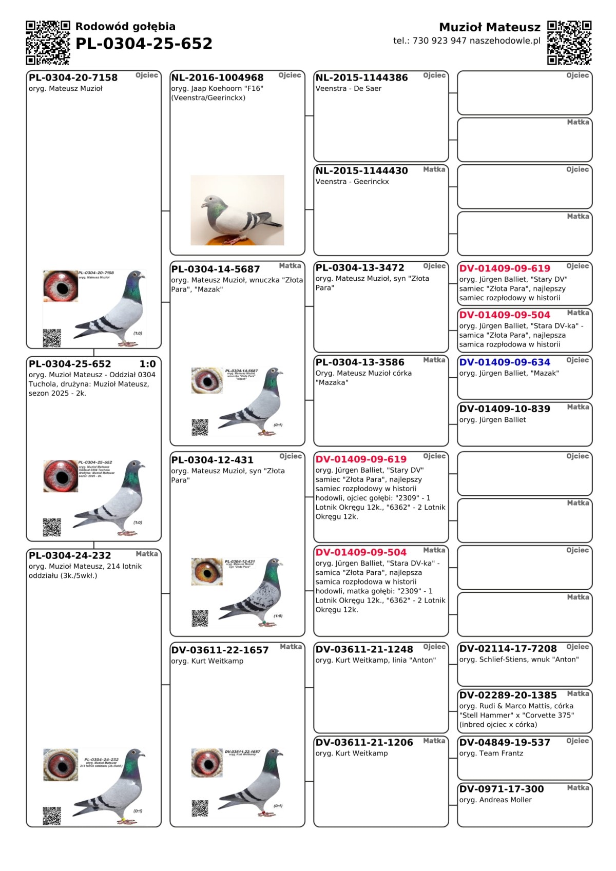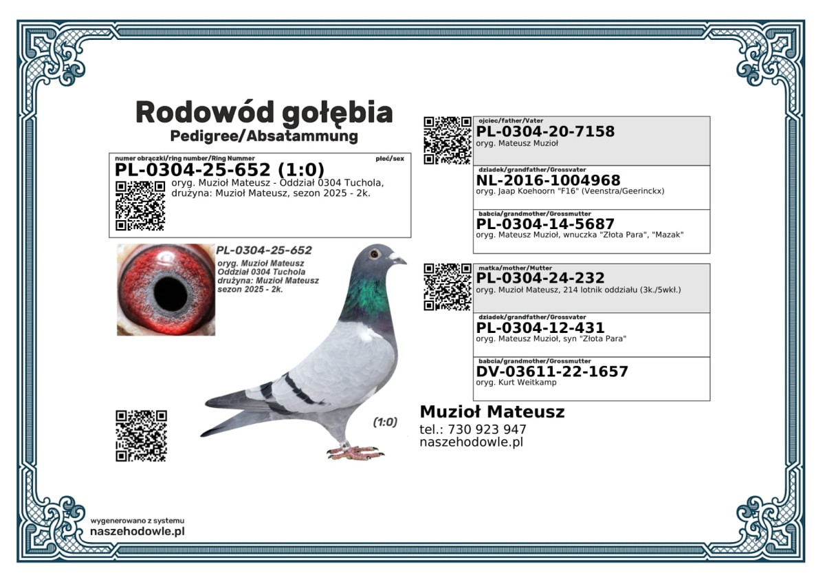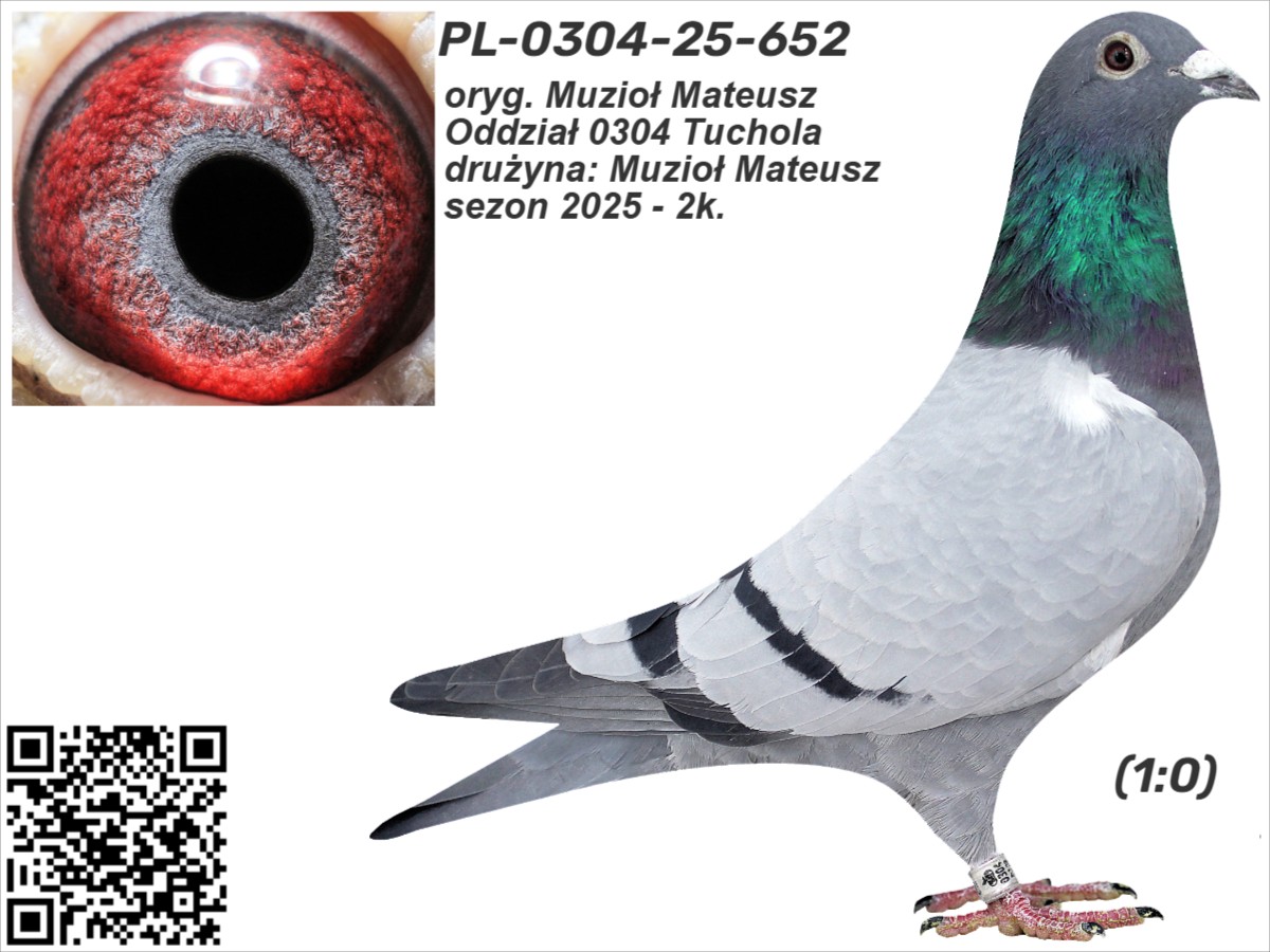 PLGP oryg. Muzioł Mateusz - Oddział 0304 Tuchola, drużyna: Muzioł Mateusz, sezon 2025 - 2k. Gołąb był lotowany w sezonie 2025 w Oddziale PZHGP 0304 Tuchola w drużynie Mateusz Muzioł w ramach Polskiej Ligii Gołębi Pocztowych. Wyniki za poszczególne loty dostępne są w tabeli wyników. Zapewniamy transport gołębi w cenie: od 1 do 6 szt. - 150 PLN i od 7 do 12 szt. 200 PLN. Gołębia można również odebrać osobiście w Tucholi lub na Wystawie Ogólnopolskiej w Katowicach. Więcej informacji u kol. Mateusza Muzioła pod