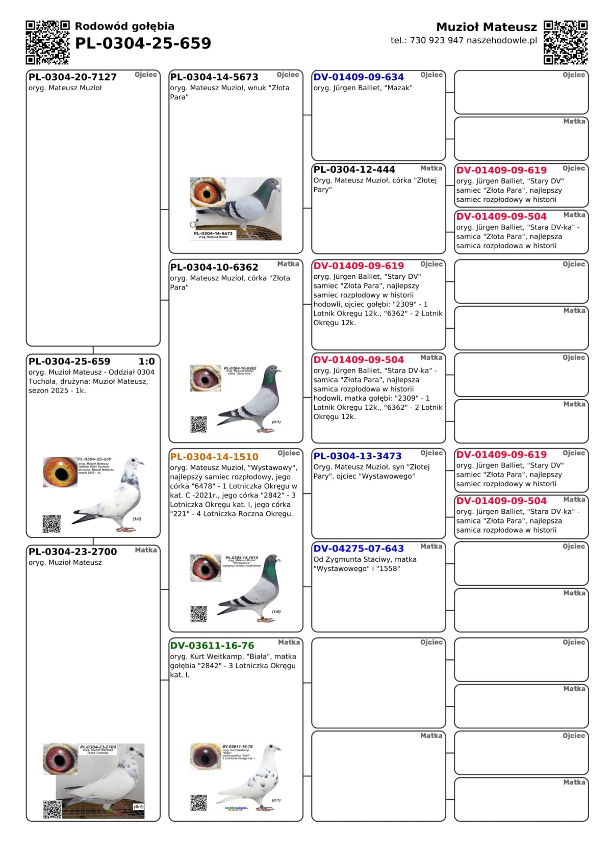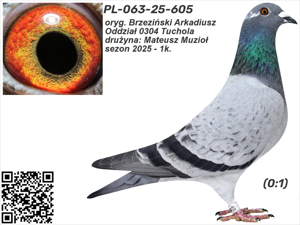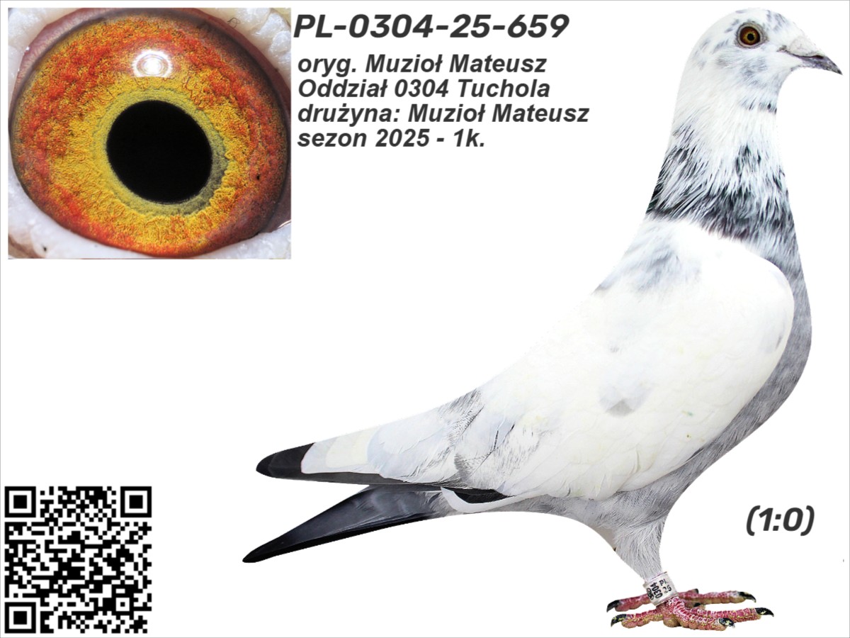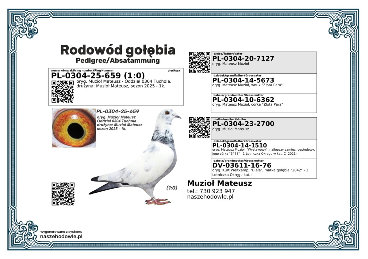 PLGP oryg. Muzioł Mateusz - Oddział 0304 Tuchola, drużyna: Muzioł Mateusz, sezon 2025 - 1k. Gołąb był lotowany w sezonie 2025 w Oddziale PZHGP 0304 Tuchola w drużynie Mateusz Muzioł w ramach Polskiej Ligii Gołębi Pocztowych. Wyniki za poszczególne loty dostępne są w tabeli wyników. Zapewniamy transport gołębi w cenie: od 1 do 6 szt. - 150 PLN i od 7 do 12 szt. 200 PLN. Gołębia można również odebrać osobiście w Tucholi lub na Wystawie Ogólnopolskiej w Katowicach. Więcej informacji u kol. Mateusza Muzioła pod