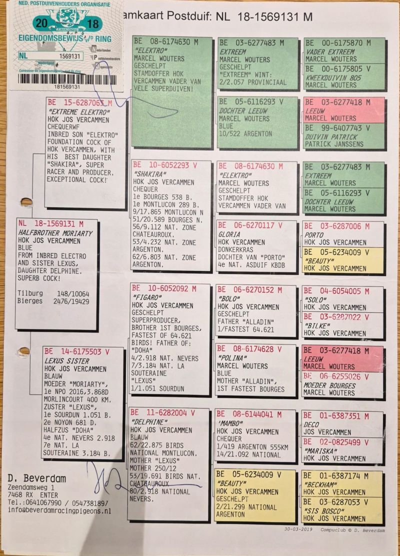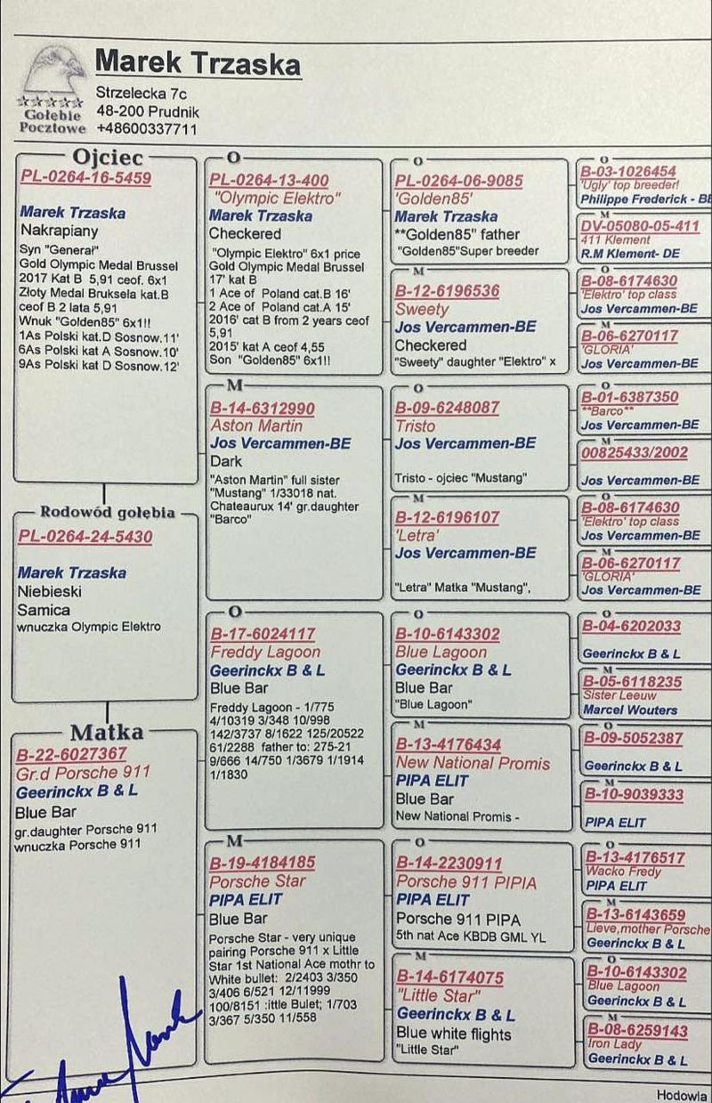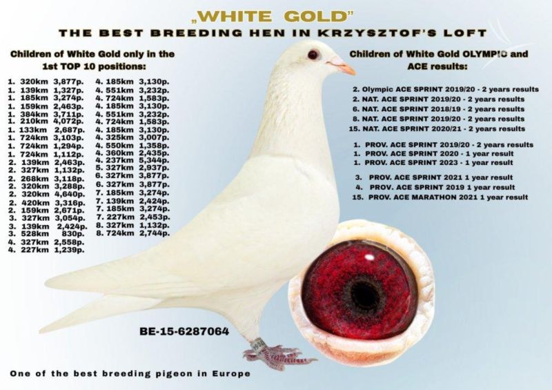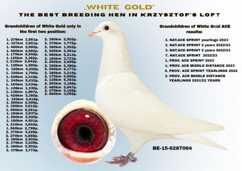 Na aukcji piękna samiczka wychowana w celi indywidualnej z najlepszej linii hodowlanej Hok Jos Vercammen. Ojcem oferowanego samczyka jest zimbredowany wnuk ELEKTRO z hodowli D. Bevardam gdzie syn Elektro (EXTREME ELEKTRO jest gniazdowym bratem WHITE GOLD u Krzysztofa Szkolnego) parowany był na siostrę wybitnego gołębia LEXUS z hodowli Hok Jos Vercammen. Matką gołębia jest oryginalna samiczka od kol. Marka Trzaski, która jest wnuczką OLIMPIC ELEKTRO (Generała) gdzie Olimpic Elektro parowany był na pełną siostrę MUSTANGA. Matką samiczki jest oryginalna samiczka od Barta Gerinckxa z najlepszych linii hodowlanych i jest ona zarazem wnuczką Porsche 911. Preferowany odbiór osobisty woj. podlaskie, ewentualnie kurier w cenie ok 150 zł, bądź odbiór na wystawie ogólnopolskiej
