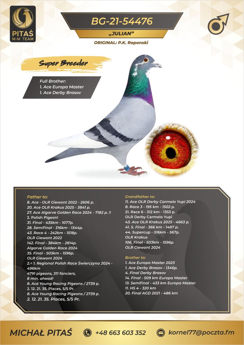 Na naszych aukcjach można znaleźć gołębie młode po pełnym programie lotowym z drużyny która zdobyła 4 Tytuły Mistrza Oddziału Bochnia 2025, II V-ce Mistrza Okręgu Kraków, 33 Przodownika Polski. Druga część aukcji to gołębie wychowane do rozpłodu, głównie z przeznaczeniem pod Wspólne Gołębniki, pochodzą z naszych najlepszych gołębi rozpłodowych, dzięki którym zdobyliśmy w tym roku tytuł Mistrza Grand Prix Poland Wspólnych Gołębników. W razie pytań proszę o kontakt pod nr tel. 663603352. Możliwa wysyłka (160 zł - paczka do 3 gołębi) lub odbiór na targach w Katowicach.