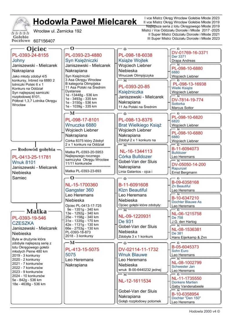 Nasza hodowla została oparta na gołębiach Leo Heremansa, Andreas Drapa, Gaby Vandanabeele, , Wa de Bruijne i przede wszystkim Wojciech Liebner (Gołębie z rodziny Braci Janssen)