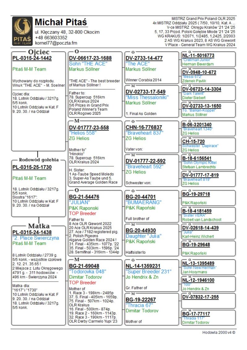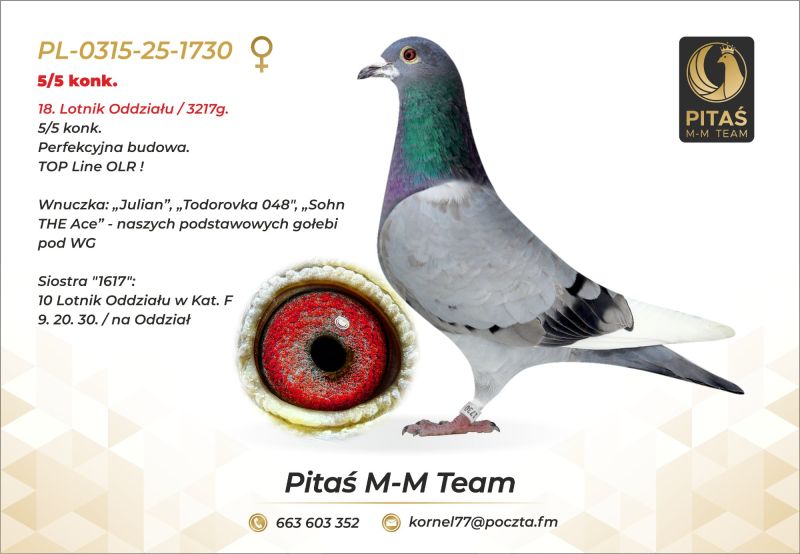 PL-0315-25-1730 - Pitaś M-M Team -5/5 konk.-18 Lotnik Oddziału -Wnuczka "Julian","Todorovka 048" "Sohn THE ACE"- TOP OLR
