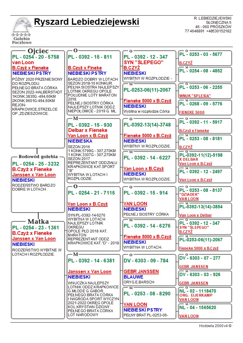 *prawdopodobnie samica* Oryginalny gołąb z hodowli Ryszard Lebiedziejewskiego. Szczegóły pochodzenia w rodowodzie. Więcej informacji pod nr tel.: 530 152 182. **Gołębie po kuracjach przygotowane do sezonu. **Transport gołębi prywatnym kurierem 100 zł do 3 szt. od 4szt do 6szt 150zł.