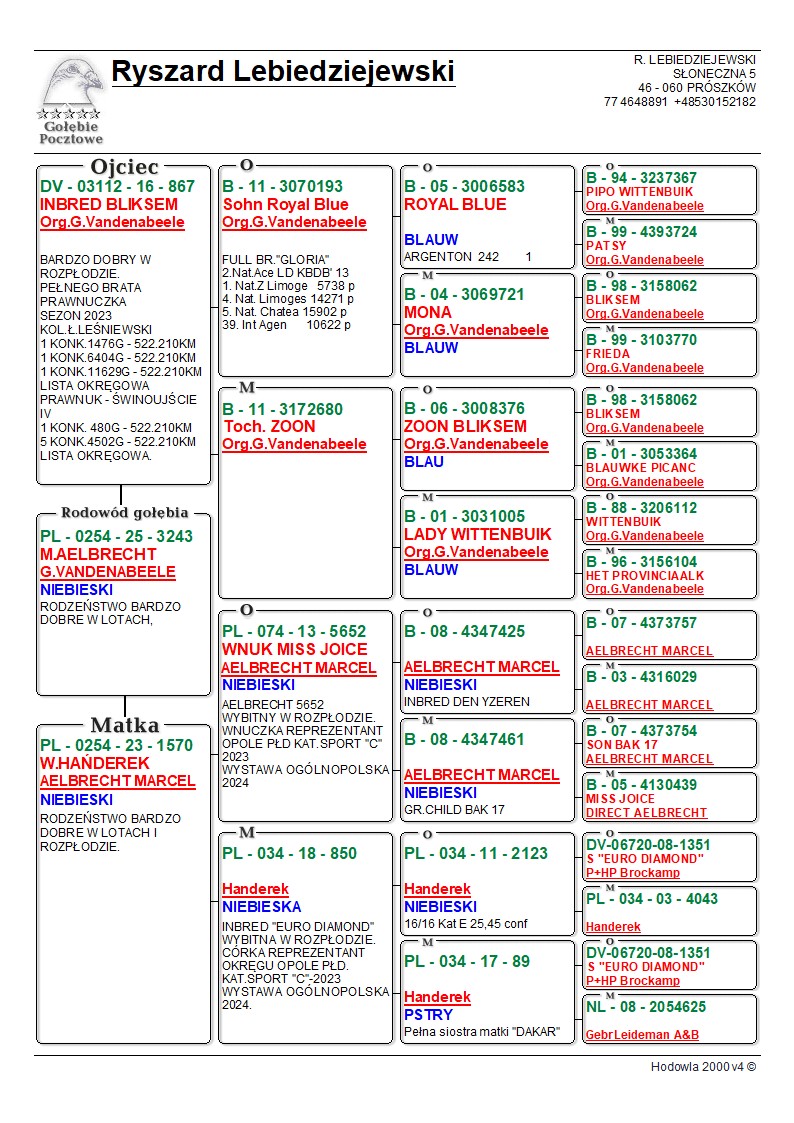*prawdopodobnie samiec* Oryginalny gołąb z hodowli Ryszard Lebiedziejewskiego. Szczegóły pochodzenia w rodowodzie. Więcej informacji pod nr tel.: 530 152 182. **Gołębie po kuracjach przygotowane do sezonu. **Transport gołębi prywatnym kurierem 100 zł do 3 szt. od 4szt do 6szt 150zł.