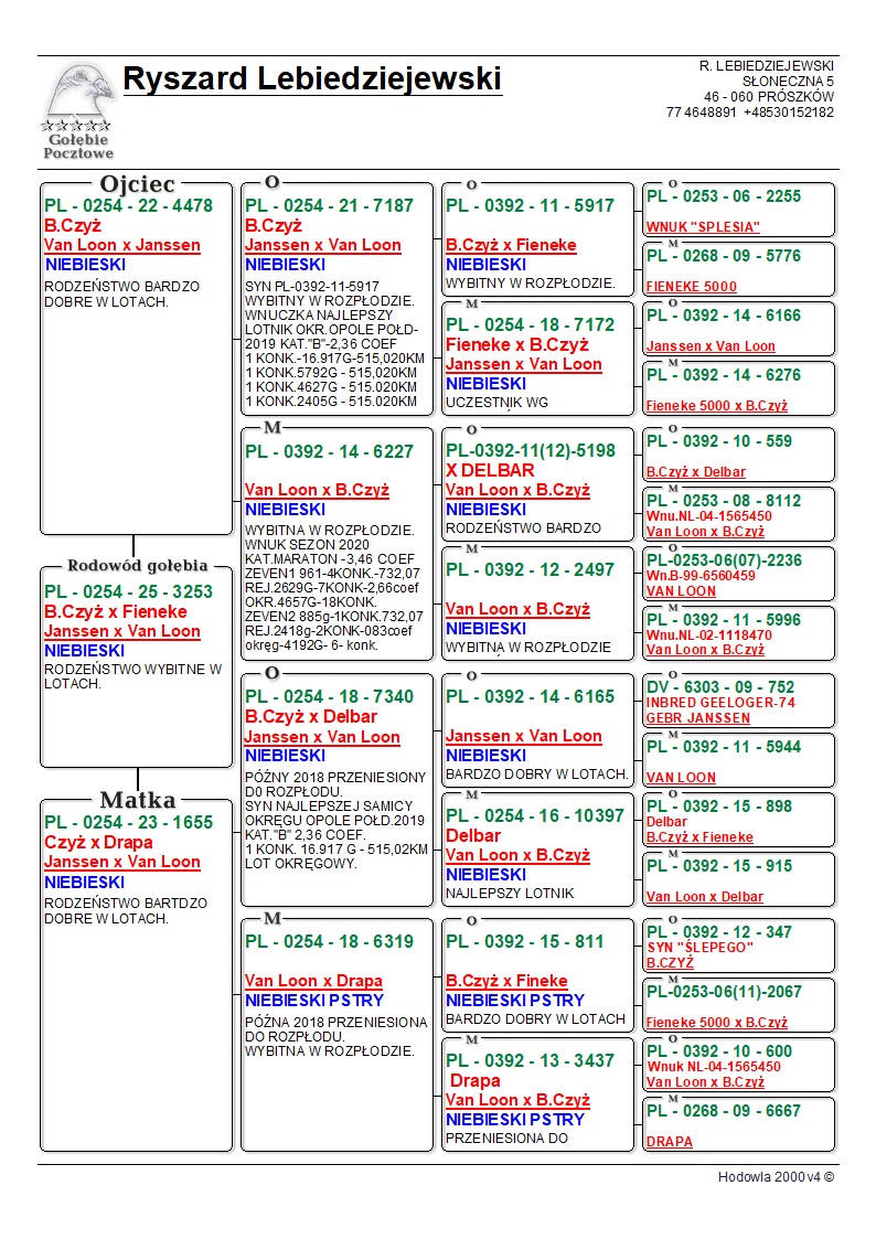 *prawdopodobnie samica* Oryginalny gołąb z hodowli Ryszard Lebiedziejewskiego. Szczegóły pochodzenia w rodowodzie. Więcej informacji pod nr tel.: 530 152 182. **Gołębie po kuracjach przygotowane do sezonu. **Transport gołębi prywatnym kurierem 100 zł do 3 szt. od 4szt do 6szt 150zł.