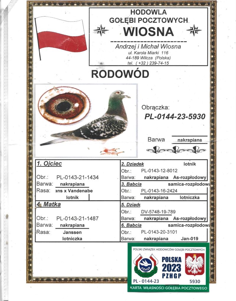 Oryginalny gołąb z hodowli Andrzej i Michał Wiosna. Szczegóły pochodzenia w rodowodzie. Więcej informacji pod numerem telefonu: 504 671 673 - Transport prywatnym kurierem lub odbiór osobisty.