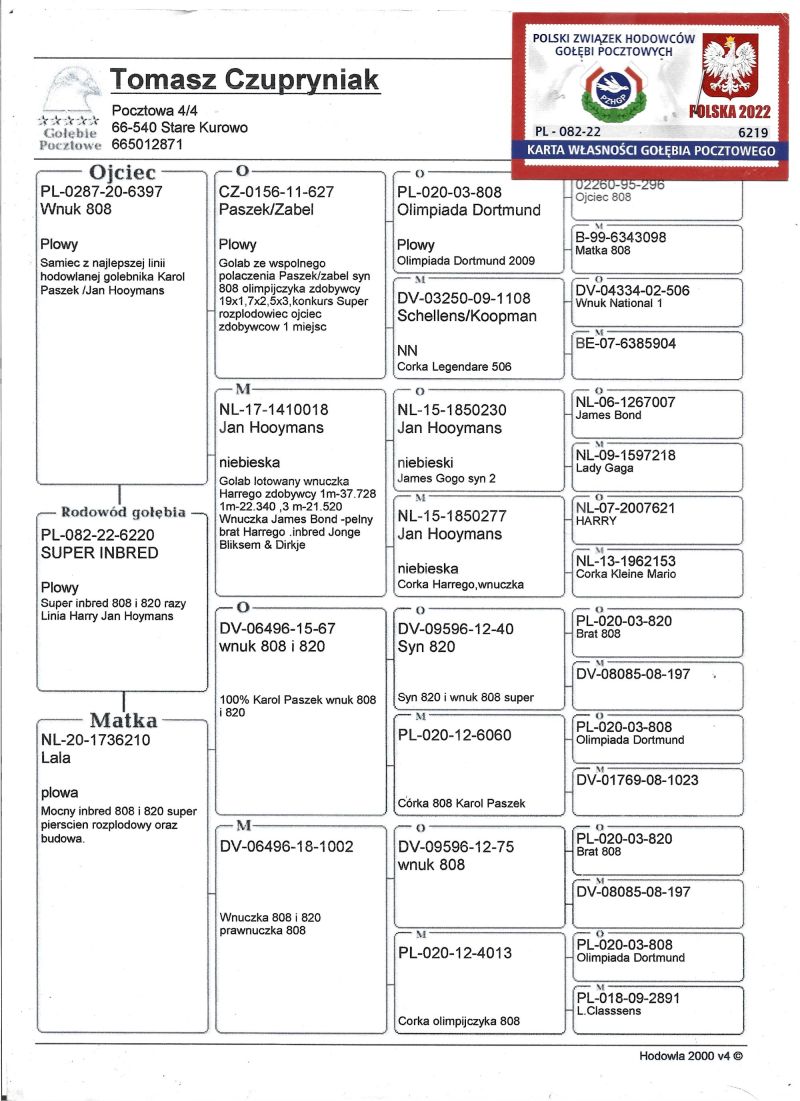 PL-082-22-6219 - Oryg. Tomasz Czupryniak - INBRED 808 i 820 x Linia "Harry" J. Hooymans