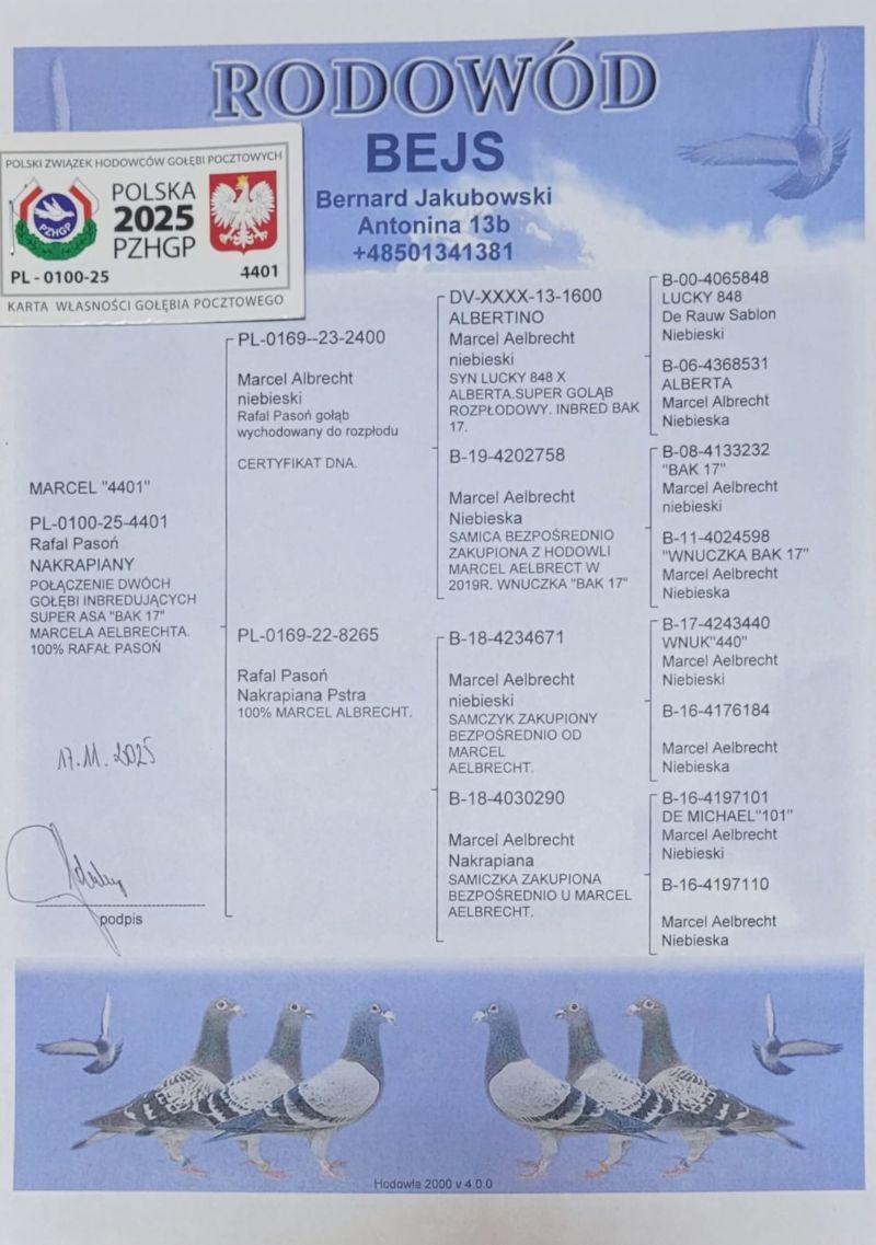 Płeć: młody gołąb Hodowca - rasa: oryg. Bernard Jakubowski 100% Marcel Aelbrecht Zakończenie: 9.12.2025 godz. 20:32