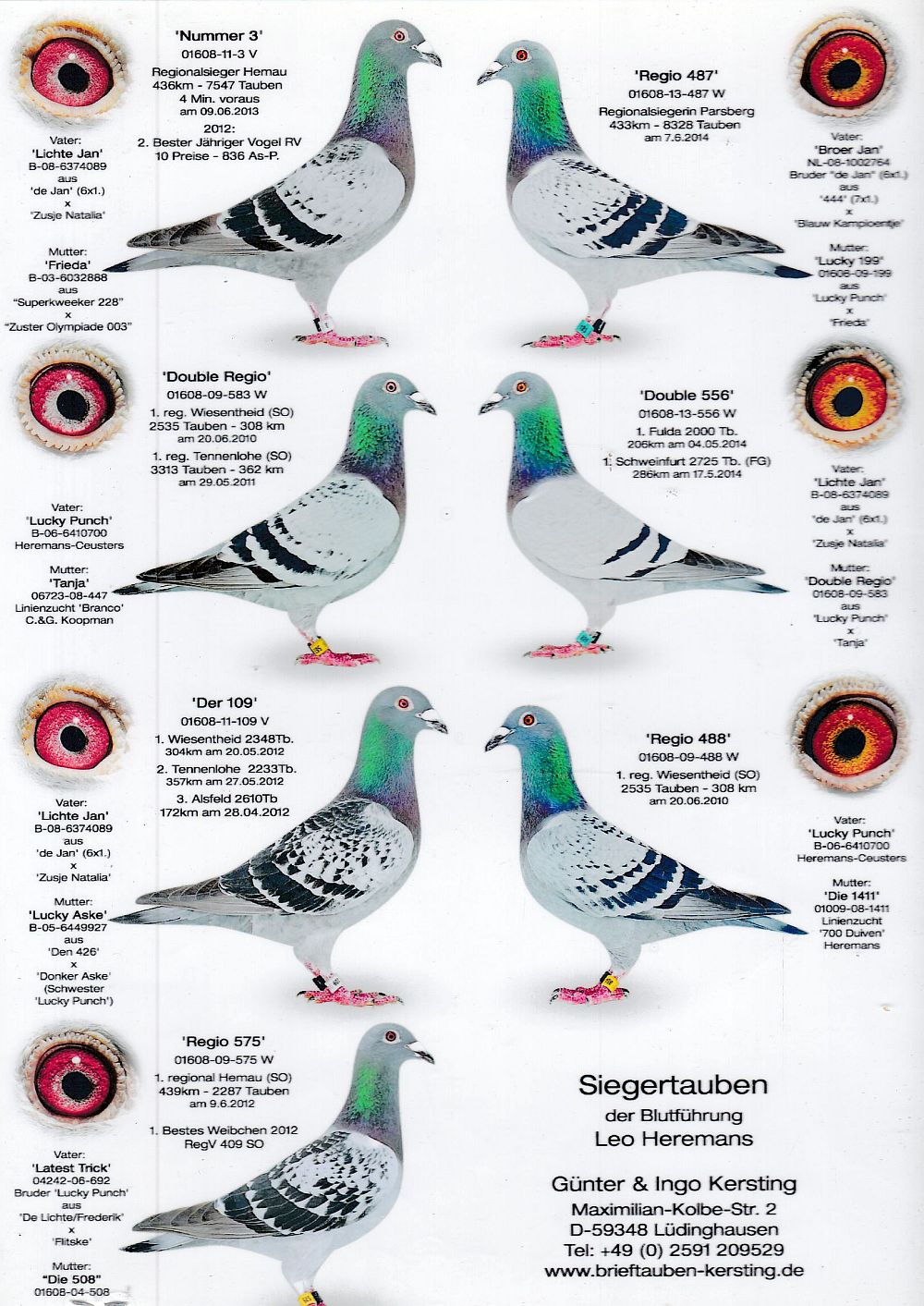 oryg. Kersting G. & I. (100% Heremans-Ceusters), syn "Lichte Jan", wnuk "Lucky Punch" Szczegóły pochodzenia w rodowodzie. Gołąb jest sprzedawany bezpośrednio od hodowcy i znajduje się w Polsce, można go obejrzeć w miejscowości Zblewo (woj. pomorskie), po wcześniejszym kontakcie telefonicznym. Więcej informacji o gołębiu i transporcie pod nr tel.: 511 607 710.