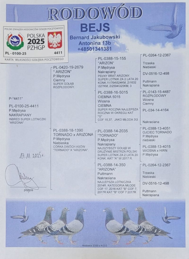 Płeć: młody gołąb Hodowca - rasa: oryg. Bernard Jakubowski inbred ARIZONA Paweł Mędrysa Zakończenie: 9.12.2025 godz. 20:38