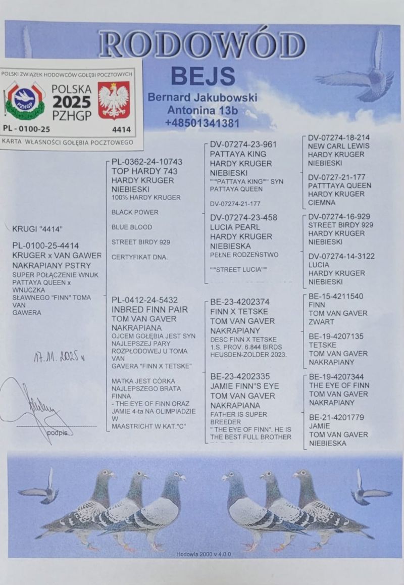 Płeć: młody gołąb Hodowca - rasa: oryg. Bernard Jakubowski Tom Van Gaver x Hardy Kruger Zakończenie: 9.12.2025 godz. 20:40