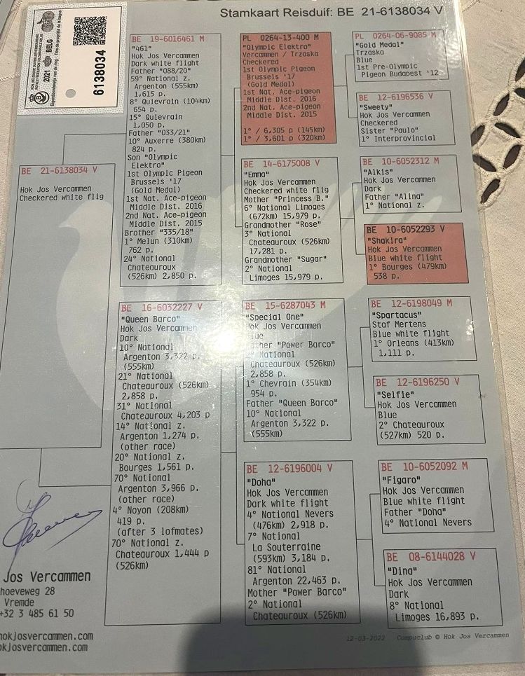 **UWAGA PODBICIE NA TEJ AUKCJI WYNOSI 50** Oryginalny gołąb z hodowli Josa Vercammena, wnuczka Olimpic Electro. Szczegóły pochodzenia w rodowodzie. Więcej informacji pod r tel.: 691 976 992 *odbiór własny lub na Wystawie Ogólnopolskiej w styczniu w Katowicach