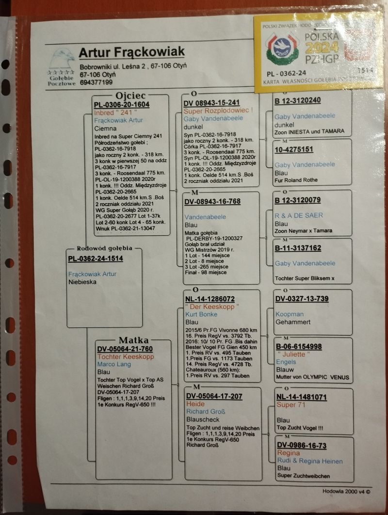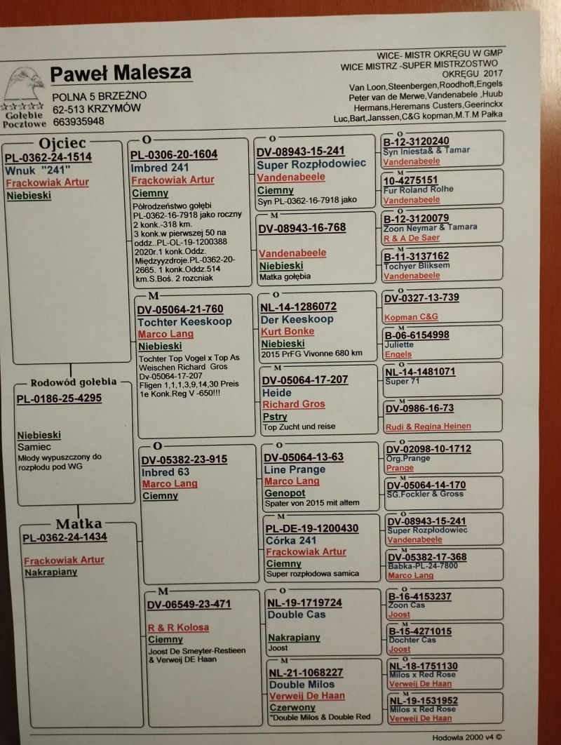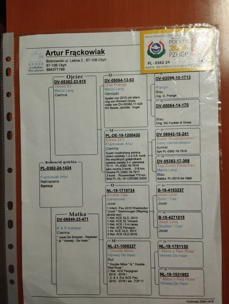 Młody gołąb z dwóch oryg.gołębi Artura Frąckowiaka.Imbred na linię Super Rozpłodowca DV-08943-15-241.Super połączenie pod WG.A.Frąckowiak zdobywca wielu czołowych nagród na kilku WG.Kurier 100 zł