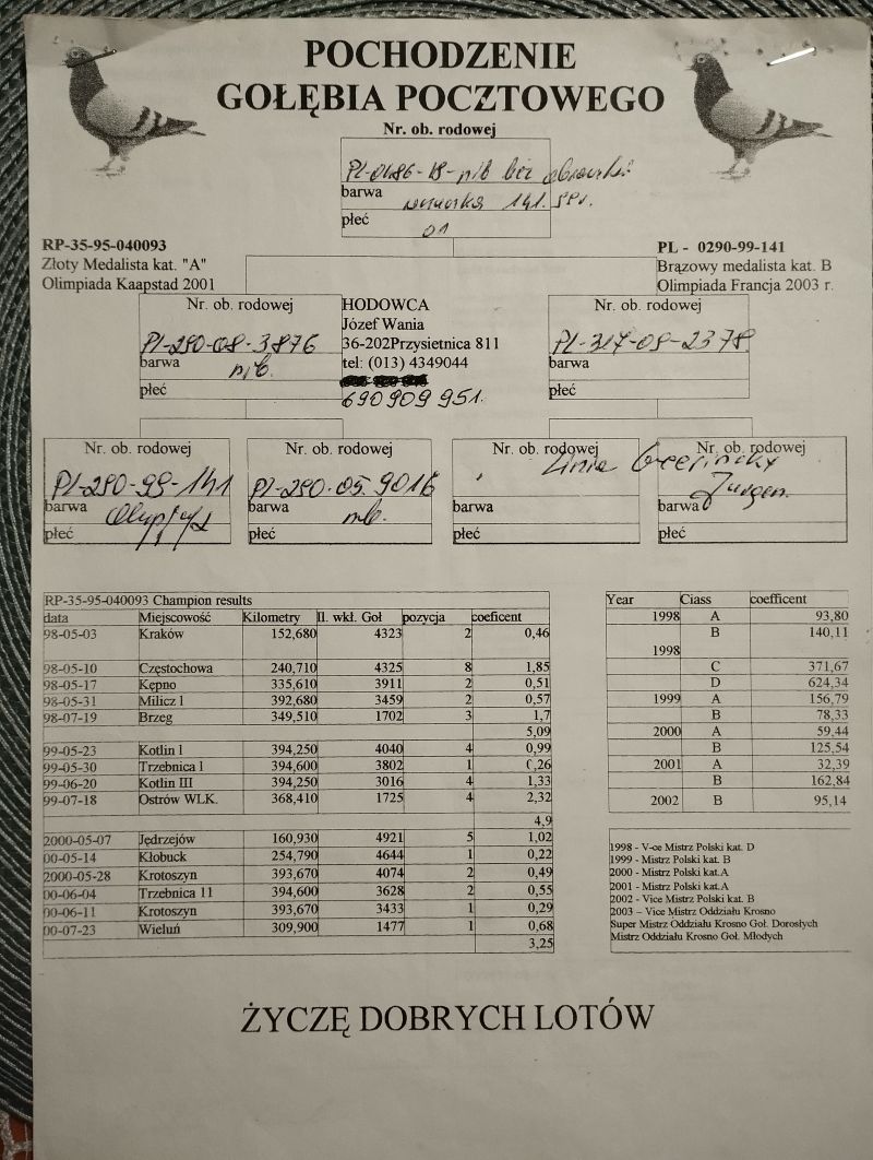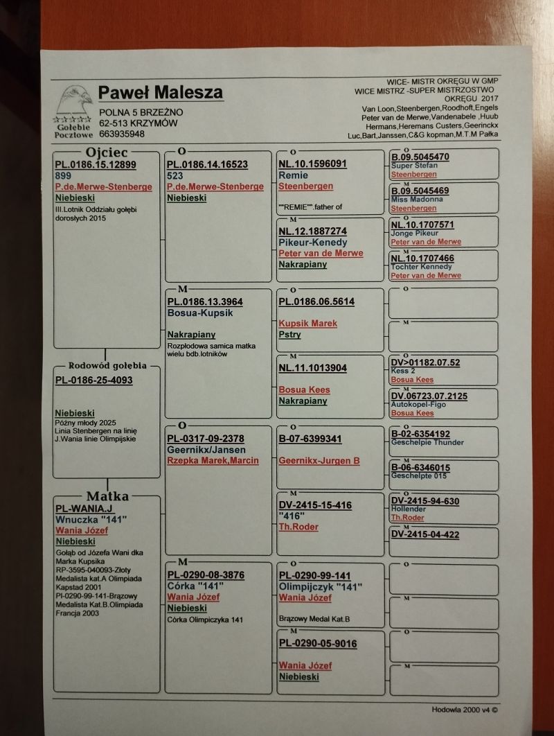 Surer połączenie gołębi J.Wani linie Olimpijskie PL-0290-99-141 / RP-35-95-040093 na linię P.De Merwe/Stenbergen.J.Wania to hodowca posiadający stare linie gołębi J.Gryt,P.Radwański. Szcegóły w rodowodzie Kurier 100 zł lub odbiór własny