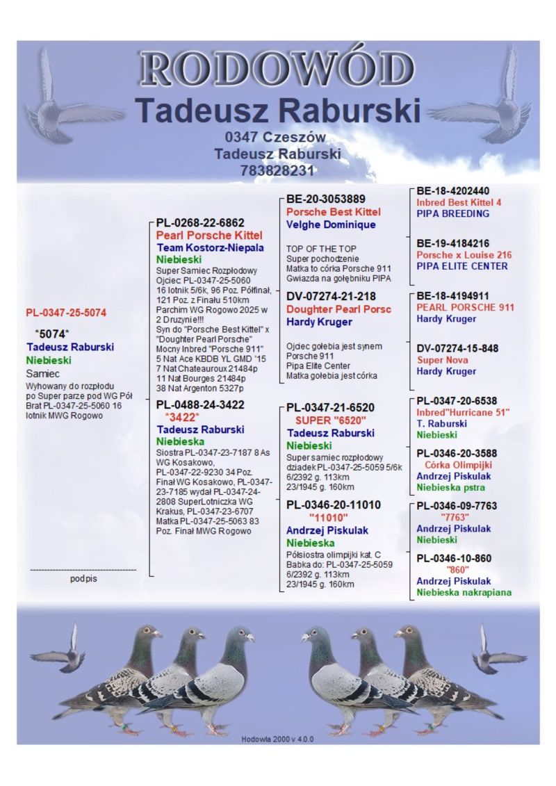 Hodowla skupiona w lotach gołębi na wspólnych gołębnikach z wieloma sukcesami. Zaprasza Państwa do licytacji wartościowego materiału do dalszej hodowli. Proponowany gołąb to linia Hardy Kruger I OLIMPIJKI KAT C, pólbrat do 16 As/4058g. MWG Rogowo. Linia moich bazowych par rozpłodowych, wielu kuzynów osiąga sukcesy na wspólnych gołębnikach, i nie tylko. Więcej informacji w rodowodzie oraz pod nr. tel. WYSYŁKA 100ZŁ