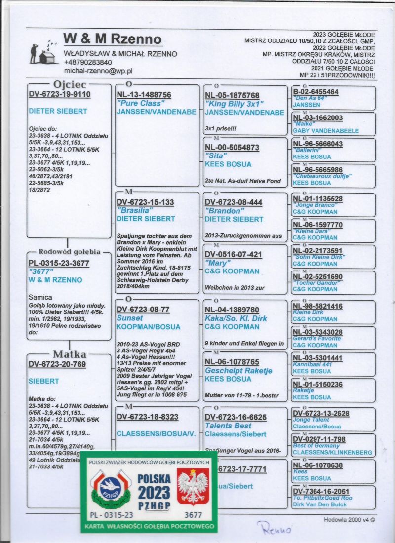 PL-0315-23-3677 - oryg. W & M Rzenno, super lotnik z mistrzowskiej drużyny 1, 19,19 konk. 100% Dieter Siebert - likwidacja rozpłodu