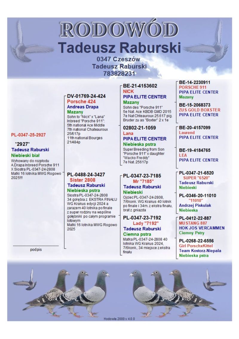 Hodowla skupiona w lotach gołębi na wspólnych gołębnikach z wieloma sukcesami. Zaprasza Państwa do licytacji wartościowego materiału do dalszej hodowli. Proponowany gołąb to wnuk Porsche 911 A. Drapa x siostra 2808 matki 16 As/4058g. MWG Rogowo. Linia moich bazowych par rozpłodowych, wielu kuzynów osiąga sukcesy na wspólnych gołębnikach, i nie tylko. Więcej informacji w rodowodzie oraz pod nr. tel. WYSYŁKA 100ZŁ